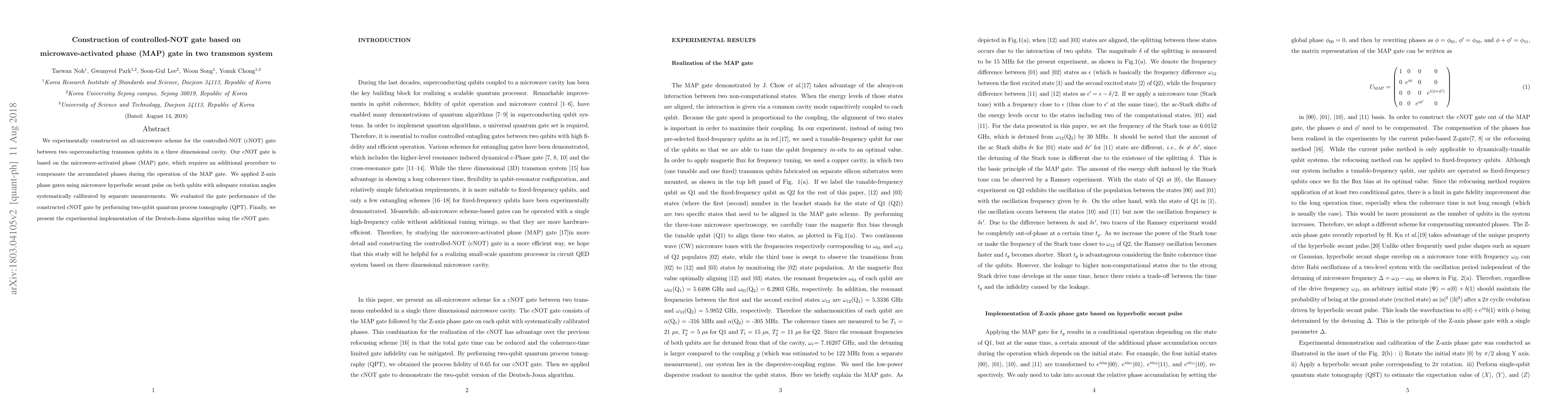 This paper details the experimental construction of a controlled-NOT (cNOT) gate between two superconducting transmon qubits using an all-microwave scheme based on a microwave-activated phase (MAP) gate. The authors evaluated the gate's performance through quantum process tomography and demonstrated its application in implementing the Deutsch-Jozsa algorithm.