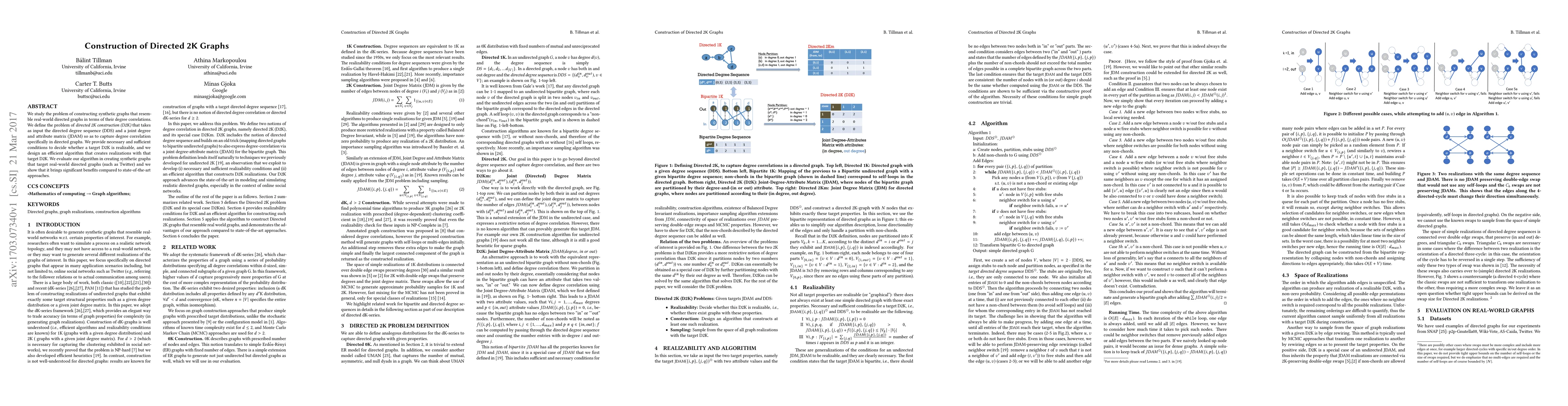 We study the problem of constructing synthetic graphs that resemble real-world directed graphs in terms of their degree correlations. We define the problem of directed 2K construction (D2K) that takes as input the directed degree sequence (DDS) and a joint degree and attribute matrix (JDAM) so as to capture degree correlation specifically in directed graphs. We provide necessary and sufficient conditions to decide whether a target D2K is realizable, and we design an efficient algorithm that creates realizations with that target D2K. We evaluate our algorithm in creating synthetic graphs that target real-world directed graphs (such as Twitter) and we show that it brings significant benefits compared to state-of-the-art approaches.