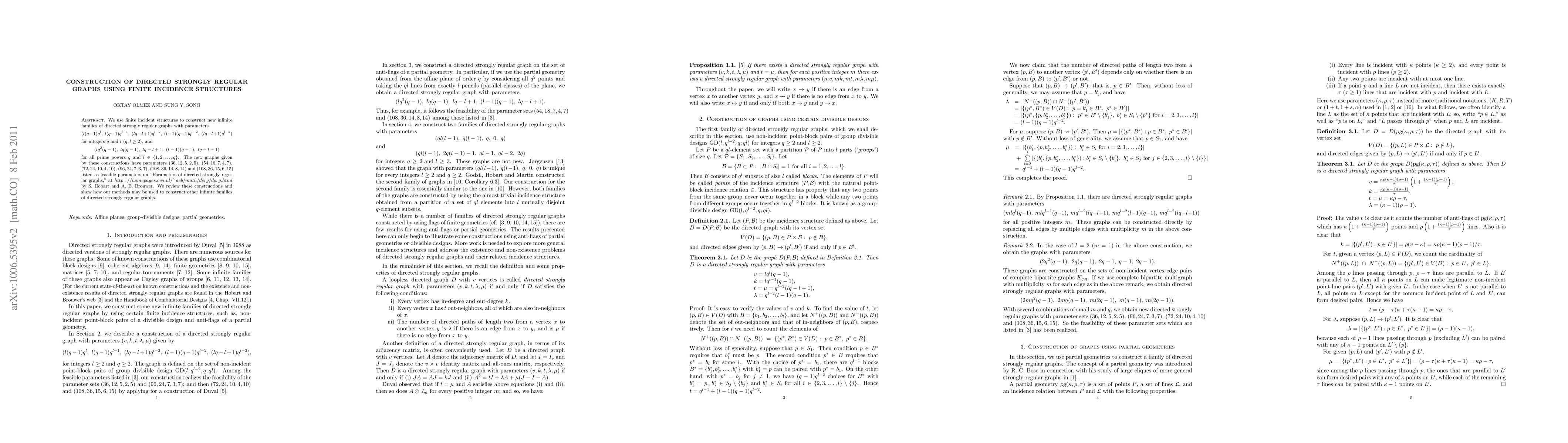 This paper constructs new infinite families of directed strongly regular graphs using finite incidence structures, presenting specific parameters for various graph configurations. The constructions yield feasible parameters listed on a referenced website, demonstrating the potential for generating additional directed strongly regular graphs.