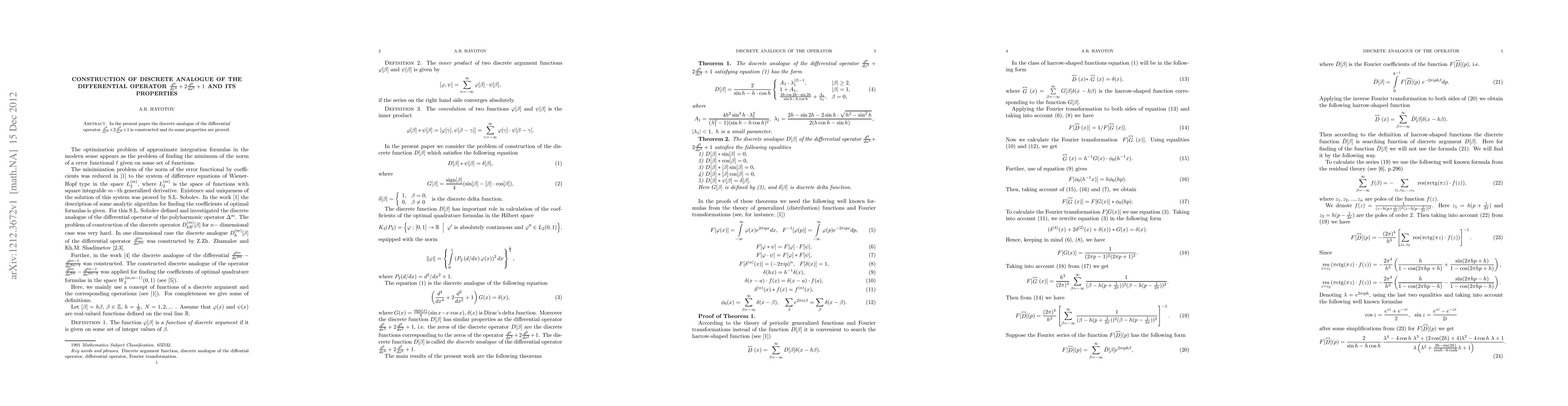 This paper constructs a discrete analogue of the differential operator $\frac{d^4}{dx^4}+2\frac{d^2}{dx^2}+1$ and proves several properties of this new discrete operator.