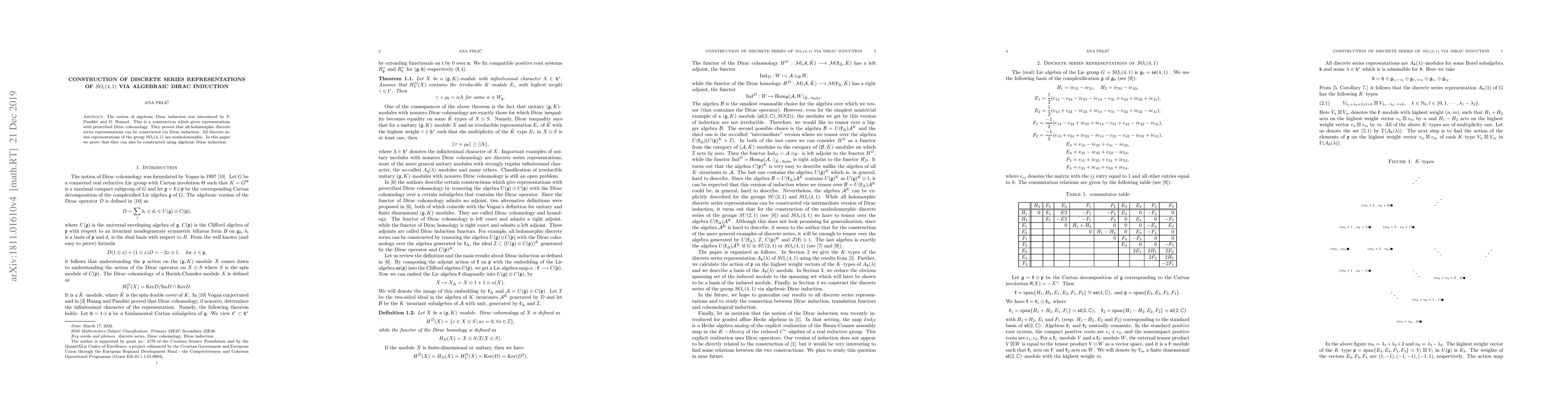 The notion of algebraic Dirac induction was introduced by P. Pand\v{z}i\'{c} and D. Renard. This is a construction which gives representations with prescribed Dirac cohomology. They proved that all holomorphic discrete series representations can be constructed via Dirac induction. All discrete series representations of the group $SO_{e}(4,1)$ are nonholomorphic. In this paper we prove that they can also be constructed using algebraic Dirac induction.