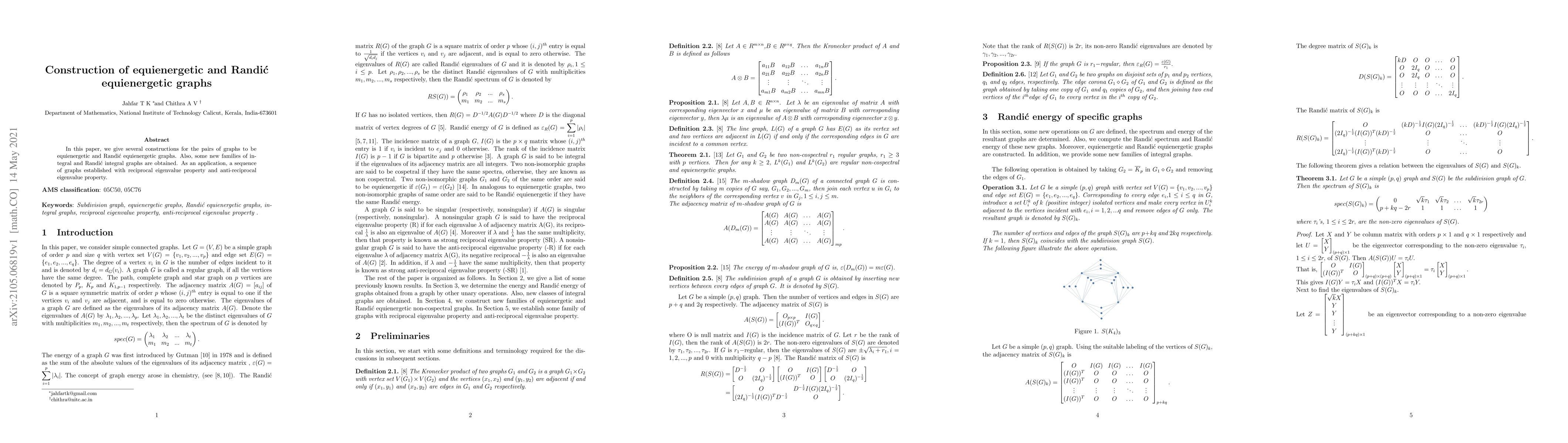This paper presents constructions for pairs of equienergetic and Randić equienergetic graphs, introducing new families of integral and Randić integral graphs. It also demonstrates a sequence of graphs with reciprocal and anti-reciprocal eigenvalue properties.
