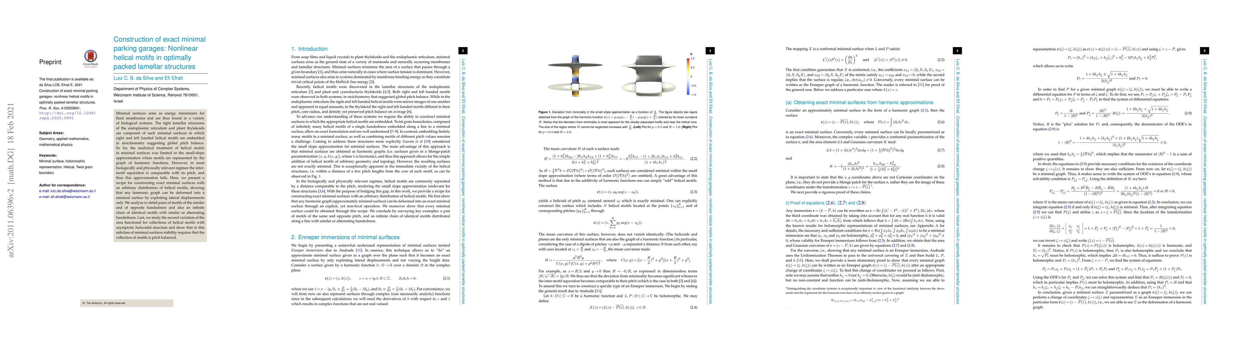 Minimal surfaces arise as energy minimizers for fluid membranes and are thus found in a variety of biological systems. The tight lamellar structures of the endoplasmic reticulum and plant thylakoids are composed of such minimal surfaces in which right and left handed helical motifs are embedded in stoichiometry suggesting global pitch balance. So far, the analytical treatment of helical motifs in minimal surfaces was limited to the small-slope approximation where motifs are represented by the graph of harmonic functions. However, in most biologically and physically relevant regimes the inter-motif separation is comparable with its pitch, and thus this approximation fails. Here, we present a recipe for constructing exact minimal surfaces with an arbitrary distribution of helical motifs, showing that any harmonic graph can be deformed into a minimal surface by exploiting lateral displacements only. We analyze in detail pairs of motifs of the similar and of opposite handedness and also an infinite chain of identical motifs with similar or alternating handedness. Last, we study the second variation of the area functional for collections of helical motifs with asymptotic helicoidal structure and show that in this subclass of minimal surfaces stability requires that the collection of motifs is pitch balanced.