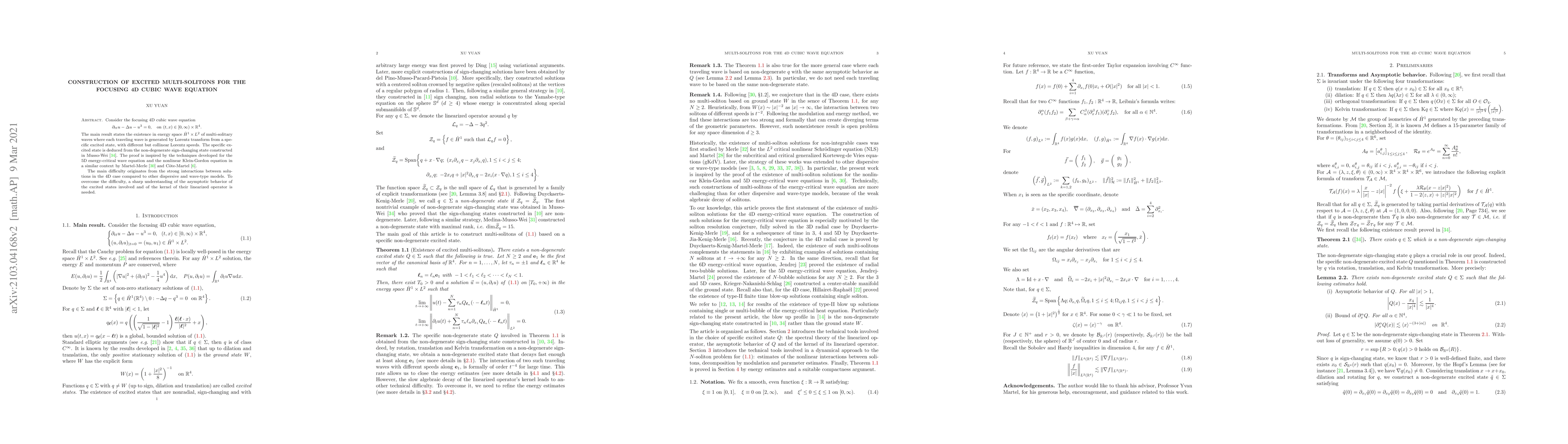 This paper constructs excited multi-solitons for the focusing 4D cubic wave equation, proving their existence in energy space. The solitons are derived from Lorentz transforms of specific excited states, addressing strong interactions through detailed asymptotic analysis.