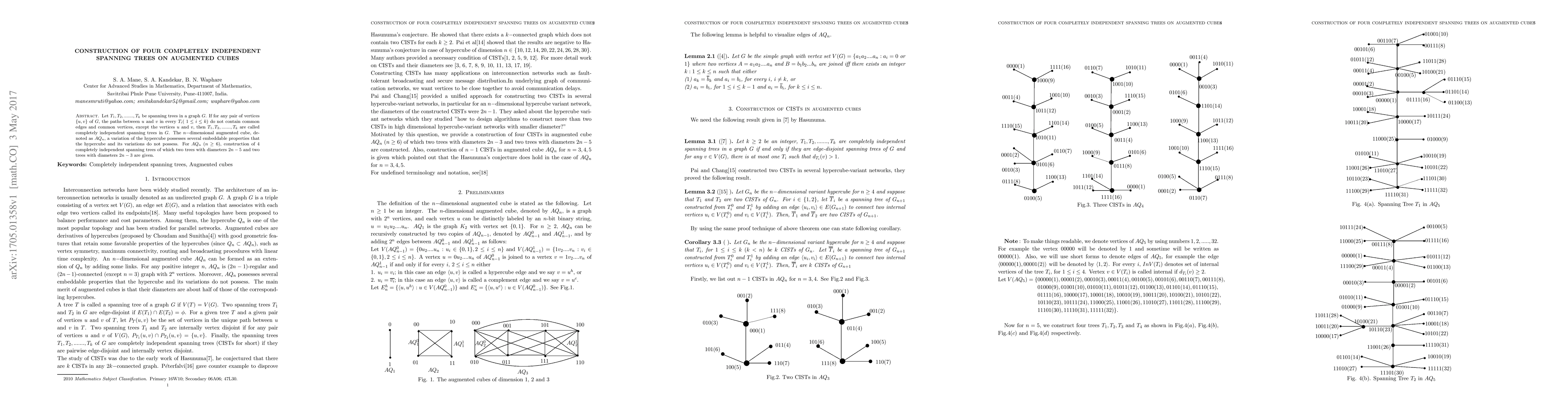 Let T1, T2,..., Tk be spanning trees in a graph G. If for any pair of vertices {u, v} of G, the paths between u and v in every Ti( 0 < i < k+1) do not contain common edges and common vertices, except the vertices u and v, then T1, T2,..., Tk are called completely independent spanning trees in G. The n-dimensional augmented cube, denoted as AQn, a variation of the hypercube possesses several embeddable properties that the hypercube and its variations do not possess. For AQn (n > 5), construction of 4 completely independent spanning trees of which two trees with diameters 2n - 5 and two trees with diameters 2n - 3 are given.