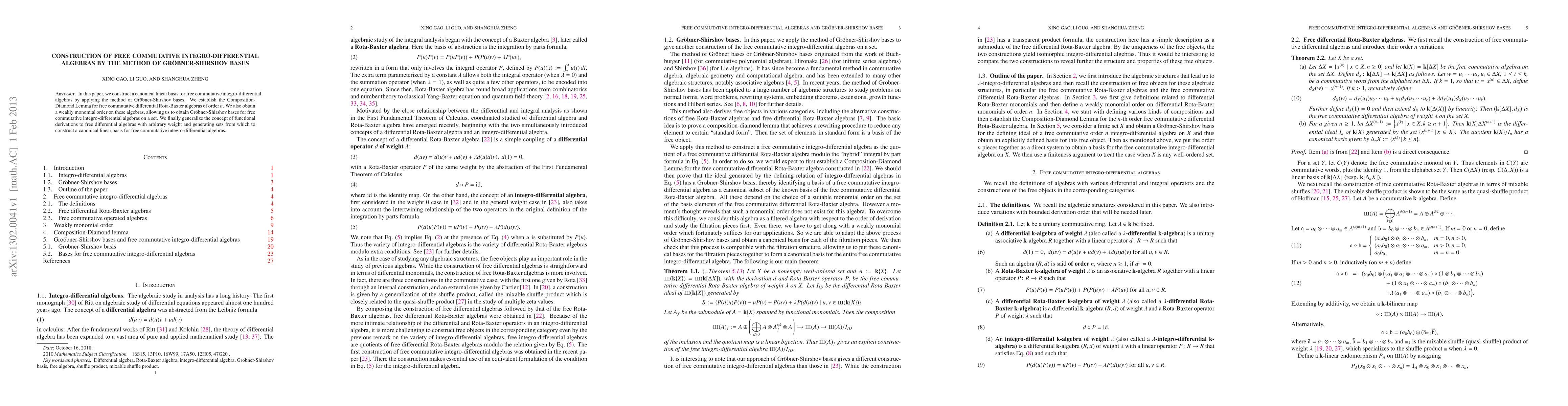 The paper introduces a novel application of Gr"obner-Shirshov bases to construct canonical bases for free commutative integro-differential algebras, along with establishing the Composition-Diamond Lemma for specific types of algebras.