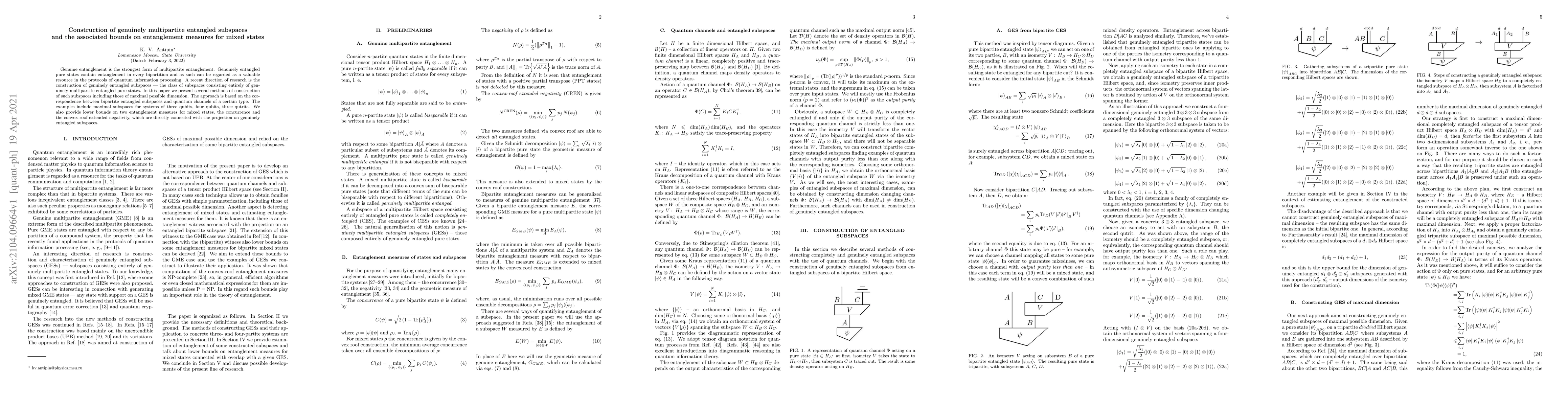This paper presents methods for constructing genuinely multipartite entangled subspaces, focusing on pure states with entanglement in every bipartition. It also provides lower bounds for entanglement measures like concurrence and convex-roof extended negativity for mixed states, using examples for systems of three to four qubits and three qutrits.