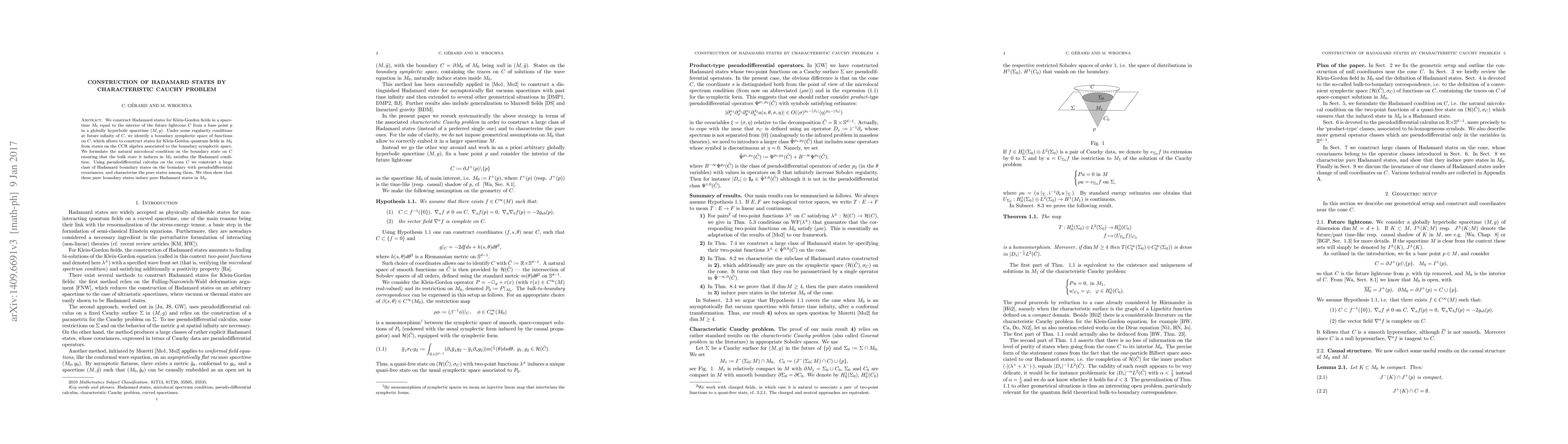 We construct Hadamard states for Klein-Gordon fields in a spacetime $M_{0}$ equal to the interior of the future lightcone $C$ from a base point $p$ in a globally hyperbolic spacetime $(M, g)$. Under some regularity conditions at future infinity of $C$, we identify a boundary symplectic space of functions on $C$, which allows to construct states for Klein-Gordon quantum fields in $M_{0}$ from states on the CCR algebra associated to the boundary symplectic space. We formulate the natural microlocal condition on the boundary state on $C$ ensuring that the bulk state it induces in $M_{0}$ satisfies the Hadamard condition. Using pseudodifferential calculus on the cone $C$ we construct a large class of Hadamard boundary states on the boundary with pseudodifferential covariances, and characterize the pure states among them. We then show that these pure boundary states induce pure Hadamard states in $M_{0}$.