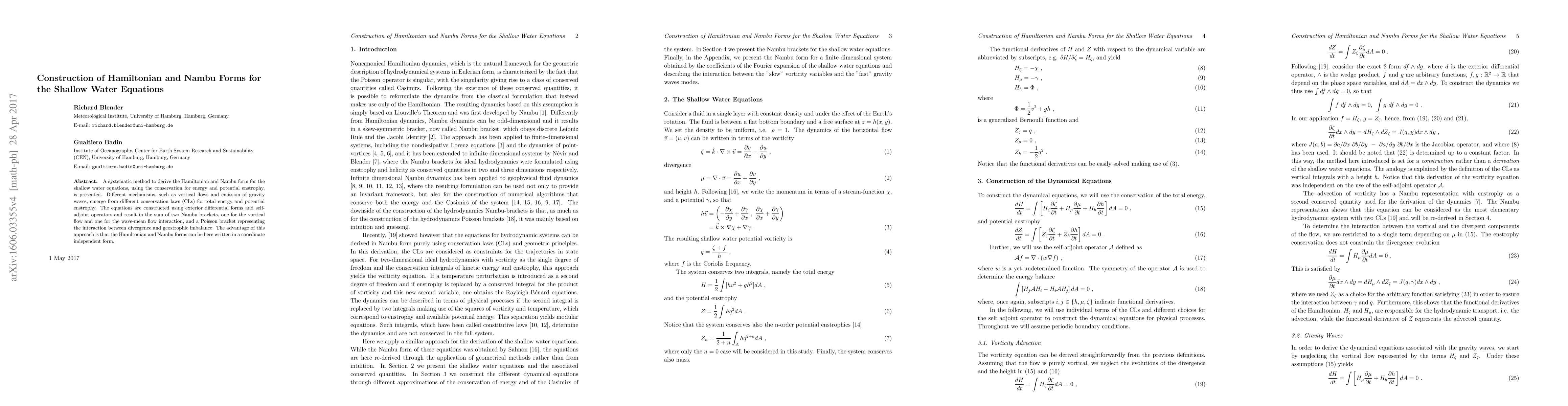 This paper presents a systematic method to derive Hamiltonian and Nambu forms for the shallow water equations, emphasizing conservation laws for energy and potential enstrophy. The approach results in a coordinate-independent formulation, revealing distinct mechanisms like vortical flows and gravity wave emissions through different conservation laws.