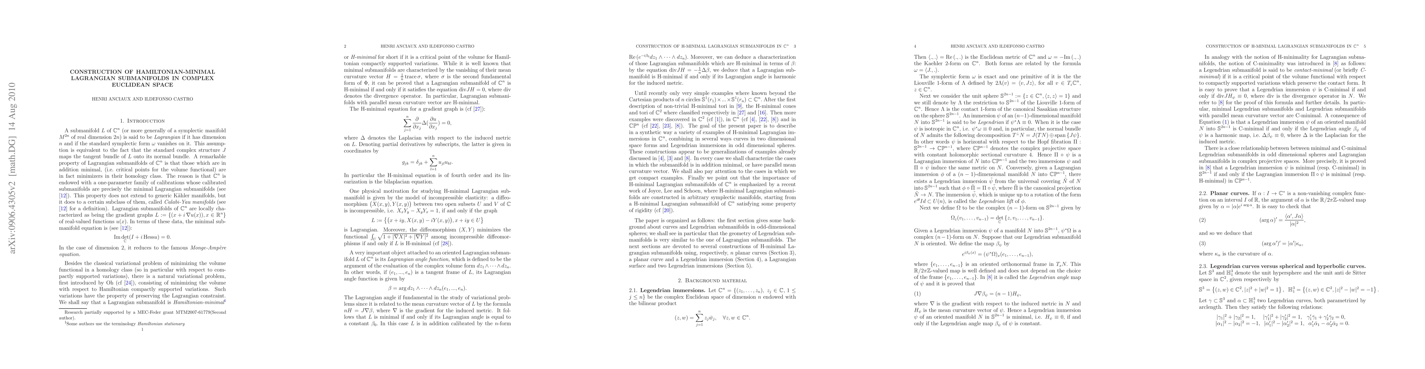 Summary: This paper explores families of H-minimal Lagrangian submanifolds in complex Euclidean space, constructed using planar, spherical, and hyperbolic curves, as well as Legendrian submanifolds, which are critical points for the volume functional under Hamiltonian variations.