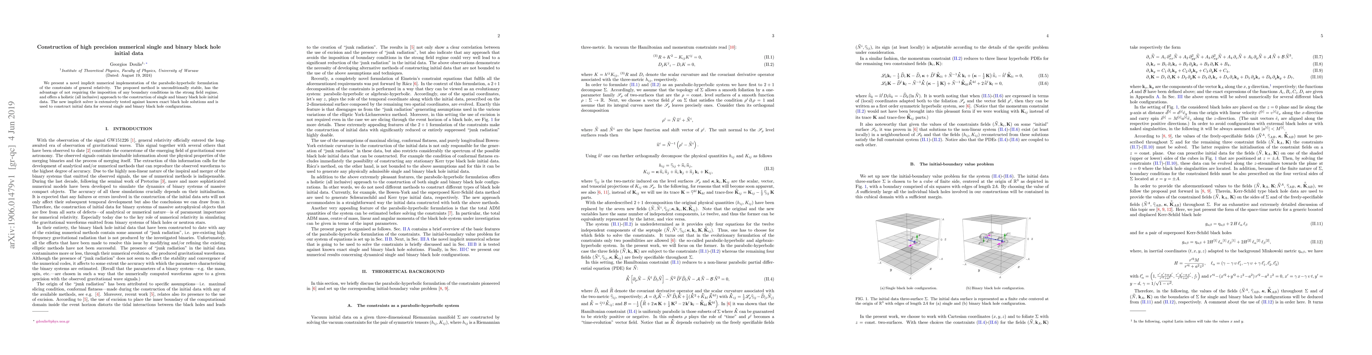 This paper introduces an implicit numerical method for constructing high precision initial data for single and binary black holes, based on a parabolic-hyperbolic formulation of general relativity constraints. The method is unconditionally stable and tested against exact solutions, providing a comprehensive approach for various black hole configurations.