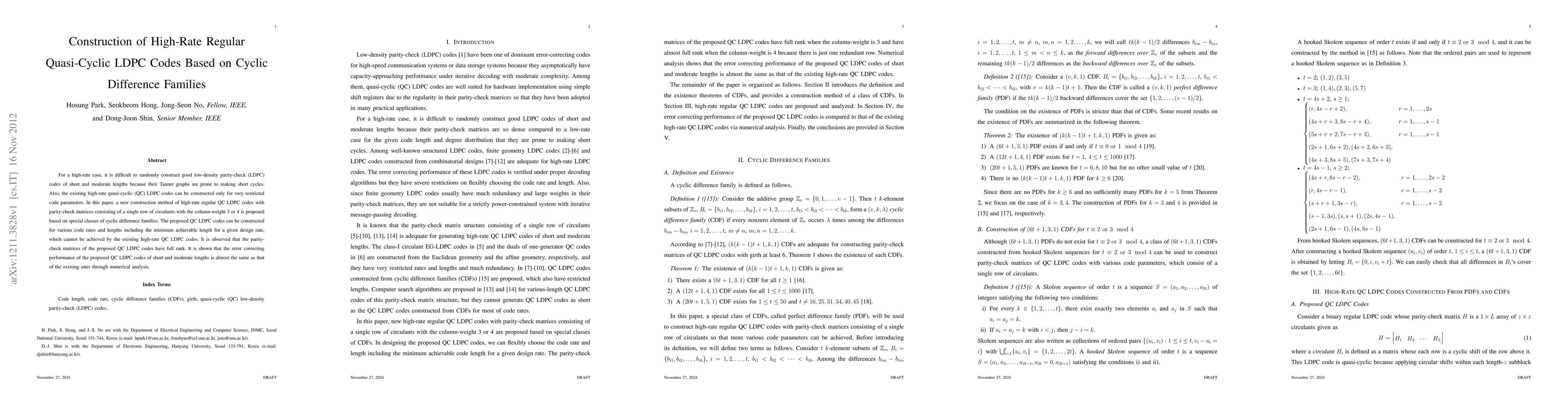 This paper introduces a novel method to construct high-rate regular quasi-cyclic LDPC codes based on cyclic difference families, overcoming limitations of existing methods in achieving good performance for short to moderate lengths. The proposed codes maintain error-correcting performance comparable to current standards while offering flexibility in code rate and length.