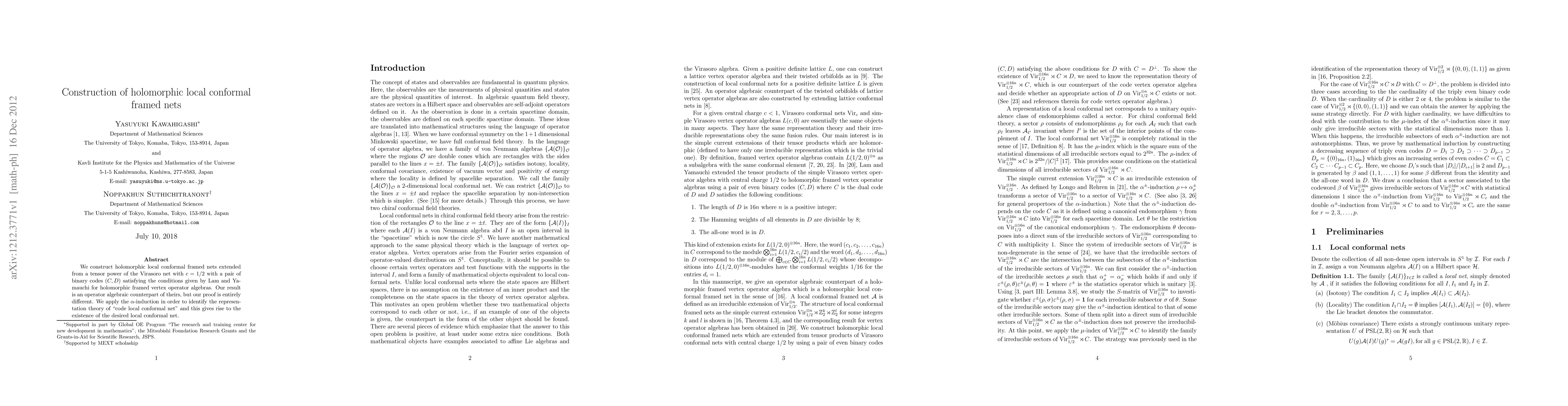 This paper constructs holomorphic local conformal framed nets from tensor powers of the Virasoro net with c=1/2 using binary codes (C,D). The authors provide an operator algebraic counterpart to previous results by Lam and Yamauchi, employing alpha-induction to establish the representation theory and existence of the desired local conformal net.