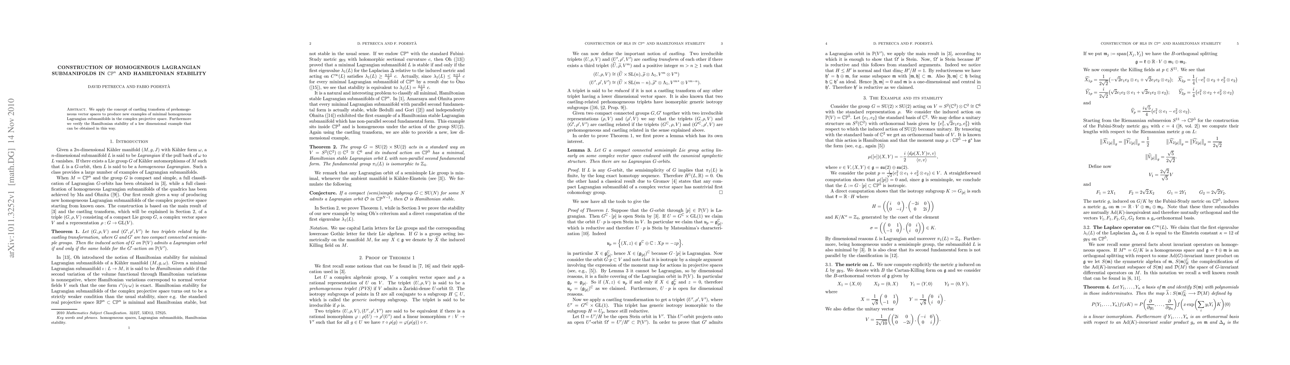 Summary: This paper constructs minimal homogeneous Lagrangian submanifolds in complex projective space using the castling transform of prehomogeneous vector spaces. It also confirms the Hamiltonian stability of a low-dimensional example derived through this method.