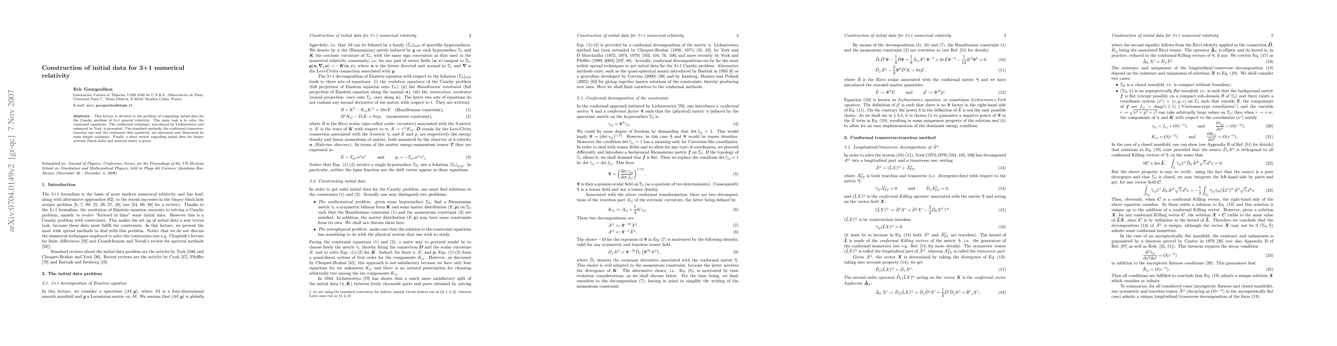 This paper discusses methods for solving the constraint equations in 3+1 general relativity, focusing on the conformal technique to construct initial data for numerical relativity. It reviews two standard methods and provides examples, concluding with a brief overview of initial data for binary systems.