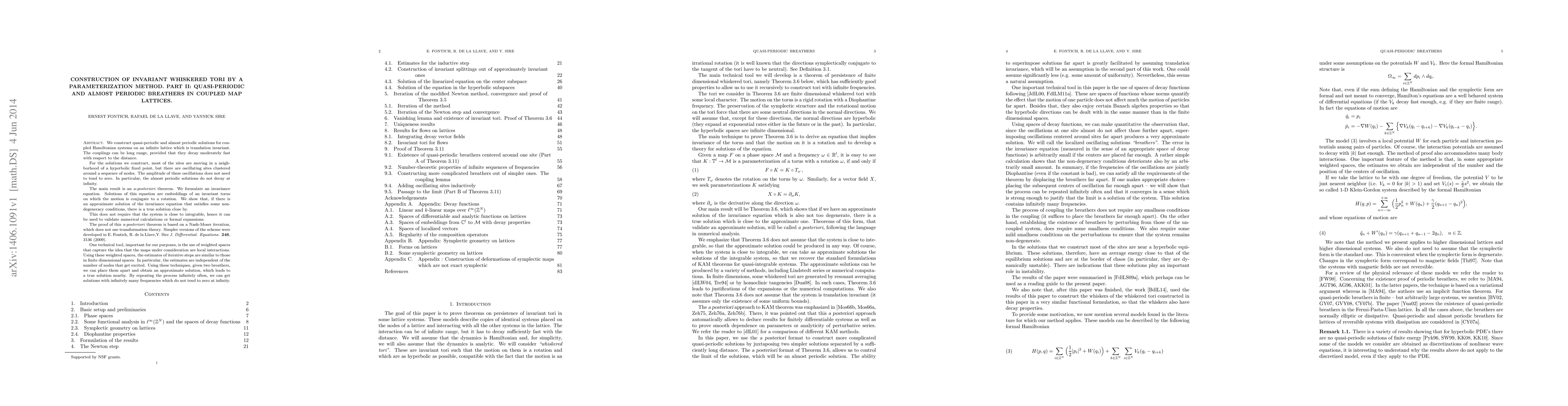 We construct quasi-periodic and almost periodic solutions for coupled Hamiltonian systems on an infinite lattice which is translation invariant. The couplings can be long range, provided that they decay moderately fast with respect to the distance. For the solutions we construct, most of the sites are moving in a neighborhood of a hyperbolic fixed point, but there are oscillating sites clustered around a sequence of nodes. The amplitude of these oscillations does not need to tend to zero. In particular, the almost periodic solutions do not decay at infinity. We formulate an invariance equation. Solutions of this equation are embeddings of an invariant torus on which the motion is conjugate to a rotation. We show that, if there is an approximate solution of the invariance equation that satisfies some non-degeneracy conditions, there is a true solution close by. The proof of this \emph{a-posteriori} theorem is based on a Nash-Moser iteration, which does not use transformation theory. Simpler versions of the scheme were developed in E. Fontich, R. de la Llave,Y. Sire \emph{J. Differential. Equations.} {\bf 246}, 3136 (2009). One technical tool, important for our purposes, is the use of weighted spaces that capture the idea that the maps under consideration are local interactions. Using these weighted spaces, the estimates of iterative steps are similar to those in finite dimensional spaces. In particular, the estimates are independent of the number of nodes that get excited. Using these techniques, given two breathers, we can place them apart and obtain an approximate solution, which leads to a true solution nearby. By repeating the process infinitely often, we can get solutions with infinitely many frequencies which do not tend to zero at infinity.