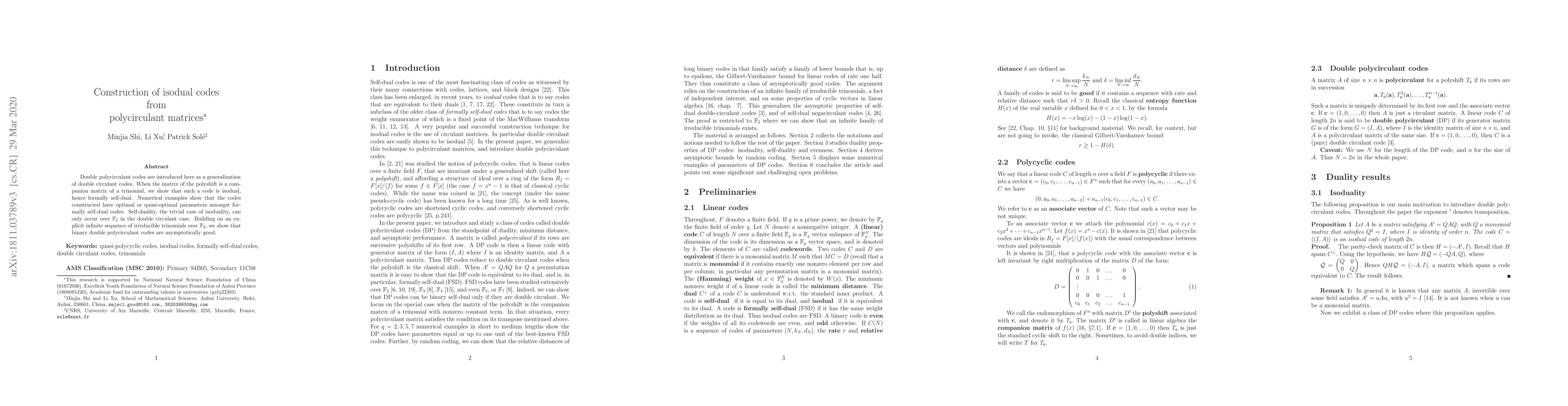 Double polycirculant codes are introduced here as a generalization of double circulant codes. When the matrix of the polyshift is a companion matrix of a trinomial, we show that such a code is isodual, hence formally self-dual. Numerical examples show that the codes constructed have optimal or quasi-optimal parameters amongst formally self-dual codes. Self-duality, the trivial case of isoduality, can only occur over $ \F_2$ in the double circulant case. Building on an explicit infinite sequence of irreducible trinomials over $\F_2,$ we show that binary double polycirculant codes are asymptotically good.