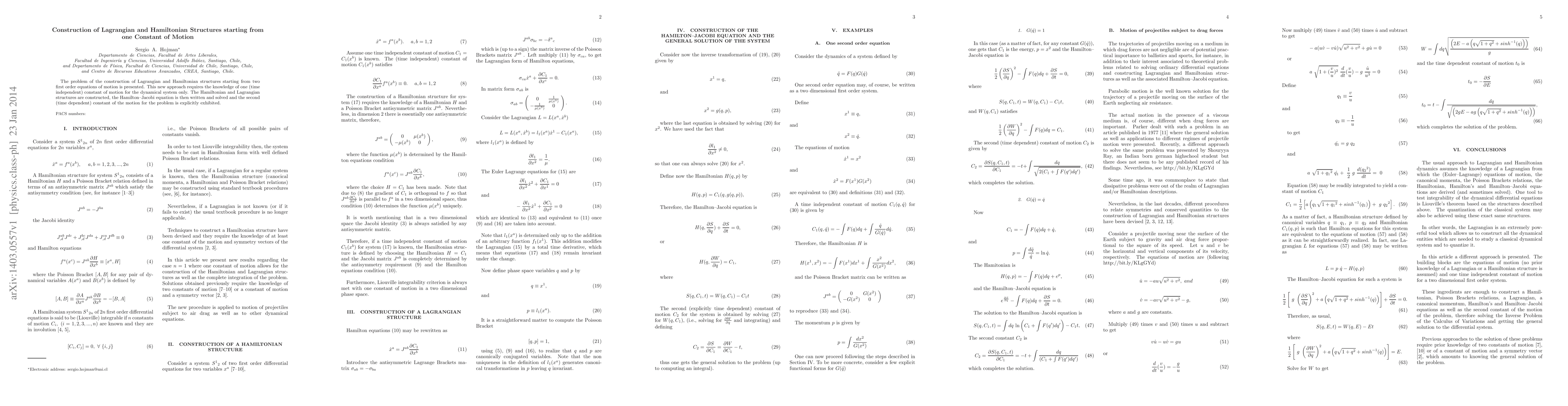This paper presents a novel method for constructing Lagrangian and Hamiltonian structures from a single time-independent constant of motion. It demonstrates the derivation of the Hamilton-Jacobi equation and solves it to reveal a second, time-dependent constant of motion.