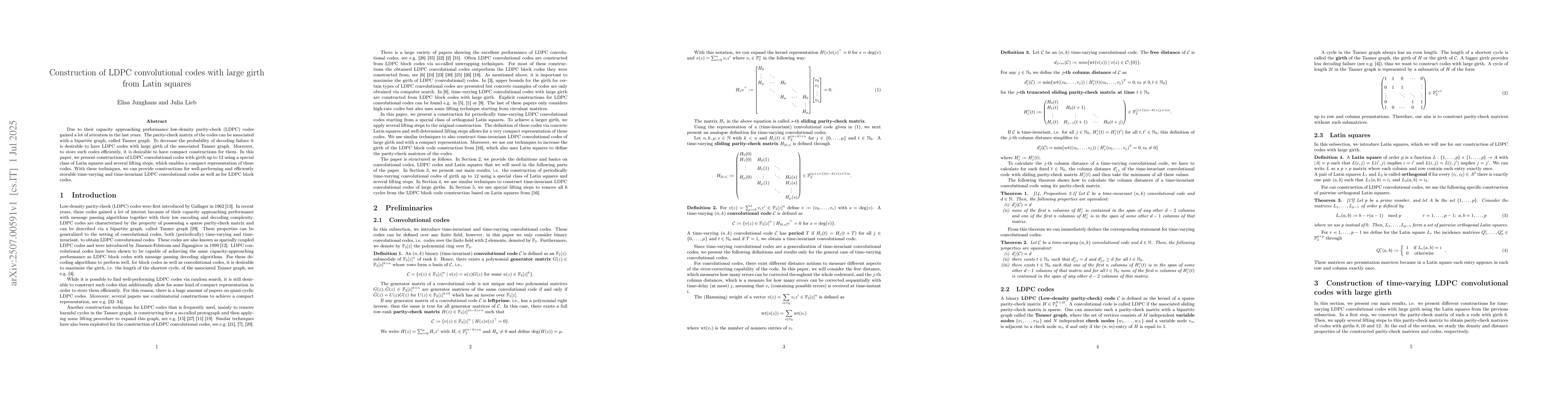 Due to their capacity approaching performance low-density parity-check (LDPC) codes gained a lot of attention in the last years. The parity-check matrix of the codes can be associated with a bipartite graph, called Tanner graph. To decrease the probability of decoding failure it is desirable to have LDPC codes with large girth of the associated Tanner graph. Moreover, to store such codes efficiently, it is desirable to have compact constructions for them. In this paper, we present constructions of LDPC convolutional codes with girth up to $12$ using a special class of Latin squares and several lifting steps, which enables a compact representation of these codes. With these techniques, we can provide constructions for well-performing and efficiently storable time-varying and time-invariant LDPC convolutional codes as well as for LDPC block codes.
