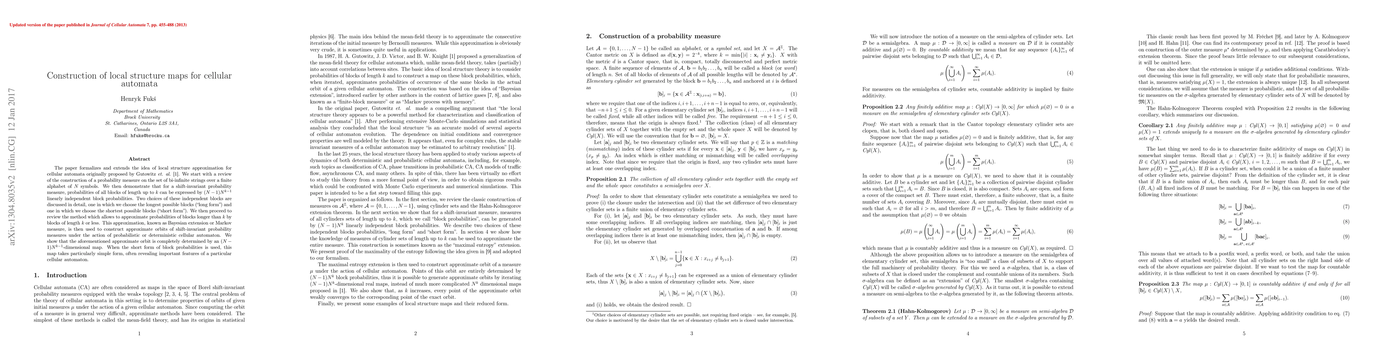 The paper formalizes and extends the idea of local structure approximation for cellular automata originally proposed by Gutowitz et. al. We start with a review of the construction of a probability measure on the set of bi-infinite strings over a finite alphabet of $N$ symbols. We then demonstrate that for a shift-invariant probability measure, probabilities of all blocks of length up to $k$ can be expressed by $(N-1)N^{k-1}$ linearly independent block probabilities. Two choices of these independent blocks are discussed in detail, one in which we choose the longest possible blocks ("long form") and one in which we choose the shortest possible blocks ("short form"). We then proceed to review the method which allows to approximate probabilities of blocks longer than $k$ by blocks of length $k$ or less. This approximation, known as Bayesian extension or Markov measure, is then used to construct approximate orbits of shift-invariant probability measures under the action of probabilistic or deterministic cellular automaton. We show that the aforementioned approximate orbit is completely determined by an $(N-1)N^{k-1}$-dimensional map. When the short form of block probabilities is used, this map takes particularly simple form, often revealing important features of a particular cellular automaton.