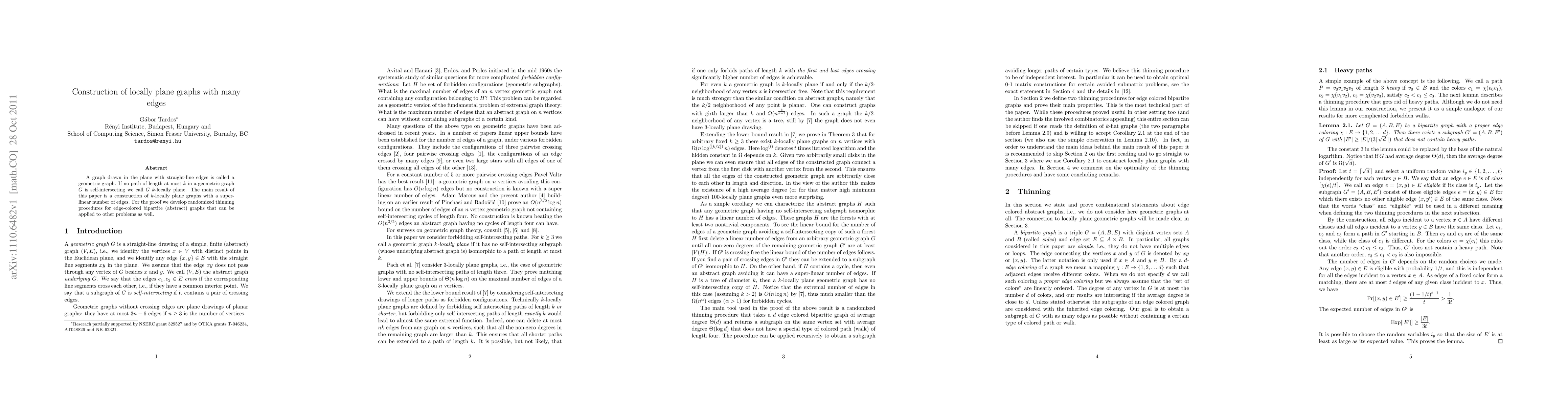 A graph drawn in the plane with straight-line edges is called a geometric graph. If no path of length at most $k$ in a geometric graph $G$ is self-intersecting we call $G$ $k$-locally plane. The main result of this paper is a construction of $k$-locally plane graphs with a super-linear number of edges. For the proof we develop randomized thinning procedures for edge-colored bipartite (abstract) graphs that can be applied to other problems as well.