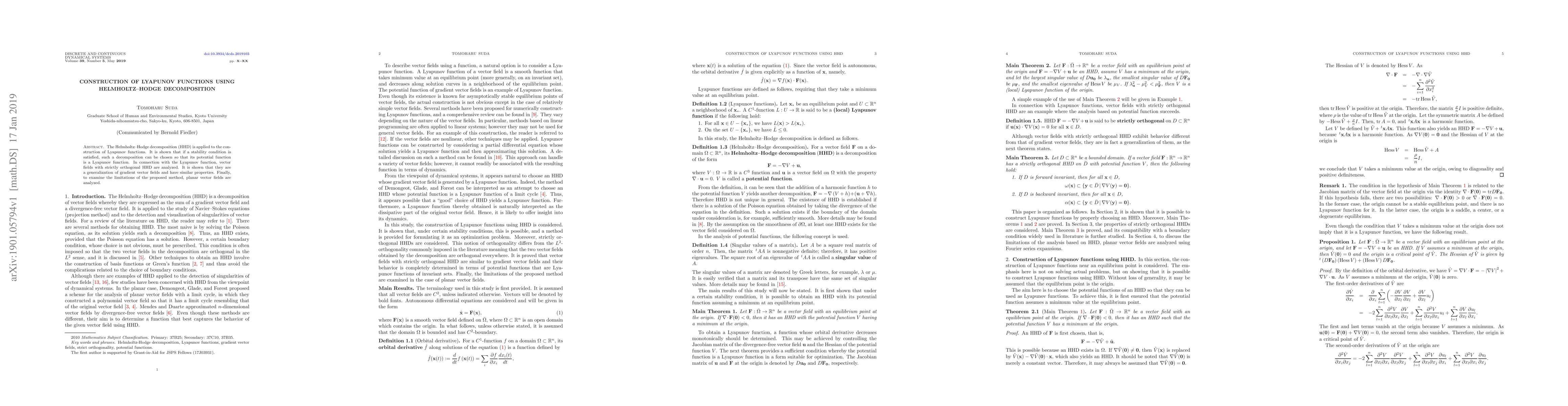 This paper constructs Lyapunov functions using Helmholtz-Hodge decomposition, demonstrating that under certain stability conditions, the potential function from such decompositions can serve as a Lyapunov function. It also explores vector fields with strictly orthogonal decompositions, showing they generalize gradient fields and analyzes planar vector fields to assess method limitations.