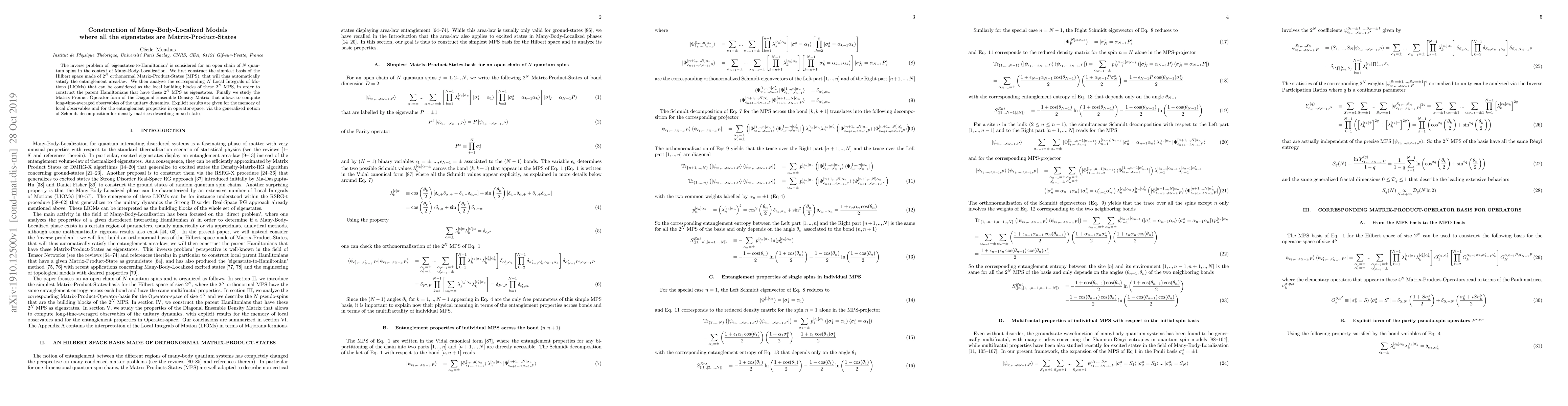The inverse problem of 'eigenstates-to-Hamiltonian' is considered for an open chain of $N$ quantum spins in the context of Many-Body-Localization. We first construct the simplest basis of the Hilbert space made of $2^N$ orthonormal Matrix-Product-States (MPS), that will thus automatically satisfy the entanglement area-law. We then analyze the corresponding $N$ Local Integrals of Motions (LIOMs) that can be considered as the local building blocks of these $2^N$ MPS, in order to construct the parent Hamiltonians that have these $2^N$ MPS as eigenstates. Finally we study the Matrix-Product-Operator form of the Diagonal Ensemble Density Matrix that allows to compute long-time-averaged observables of the unitary dynamics. Explicit results are given for the memory of local observables and for the entanglement properties in operator-space, via the generalized notion of Schmidt decomposition for density matrices describing mixed states.