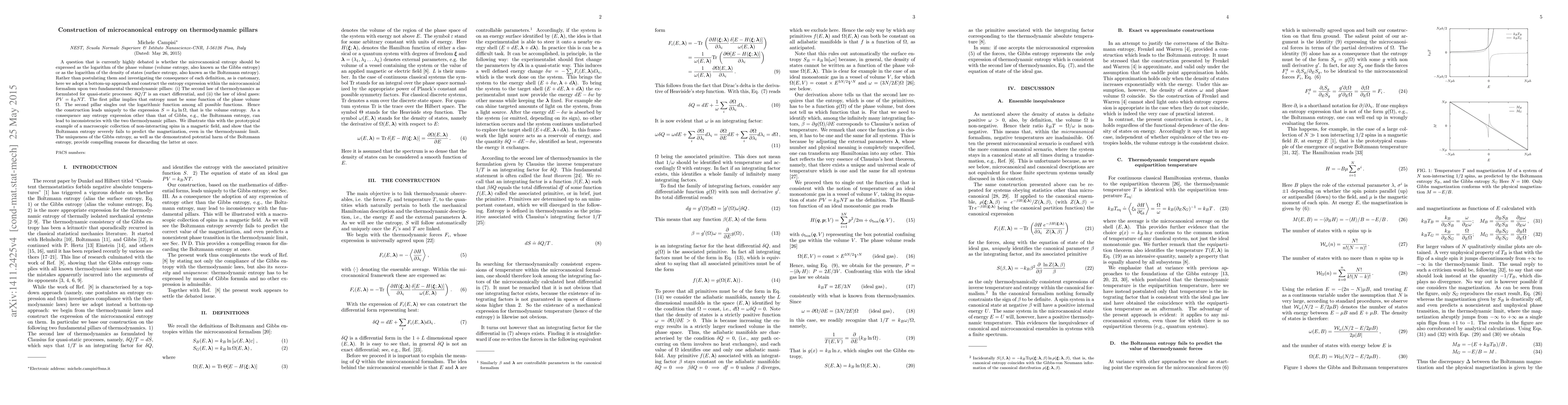 A question that is currently highly debated is whether the microcanonical entropy should be expressed as the logarithm of the phase volume (volume entropy, also known as the Gibbs entropy) or as the logarithm of the density of states (surface entropy, also known as the Boltzmann entropy). Rather than postulating them and investigating the consequence of each definition, as is customary, here we adopt a bottom-up approach and construct the entropy expression within the microcanonical formalism upon two fundamental thermodynamic pillars: (i) The second law of thermodynamics as formulated for quasi-static processes: $\delta Q/T$ is an exact differential, and (ii) the law of ideal gases: $PV=k_B NT$. The first pillar implies that entropy must be some function of the phase volume $\Omega$. The second pillar singles out the logarithmic function among all possible functions. Hence the construction leads uniquely to the expression $S= k_B \ln \Omega$, that is the volume entropy. As a consequence any entropy expression other than that of Gibbs, e.g., the Boltzmann entropy, can lead to inconsistencies with the two thermodynamic pillars. We illustrate this with the prototypical example of a macroscopic collection of non-interacting spins in a magnetic field, and show that the Boltzmann entropy severely fails to predict the magnetization, even in the thermodynamic limit. The uniqueness of the Gibbs entropy, as well as the demonstrated potential harm of the Boltzmann entropy, provide compelling reasons for discarding the latter at once.