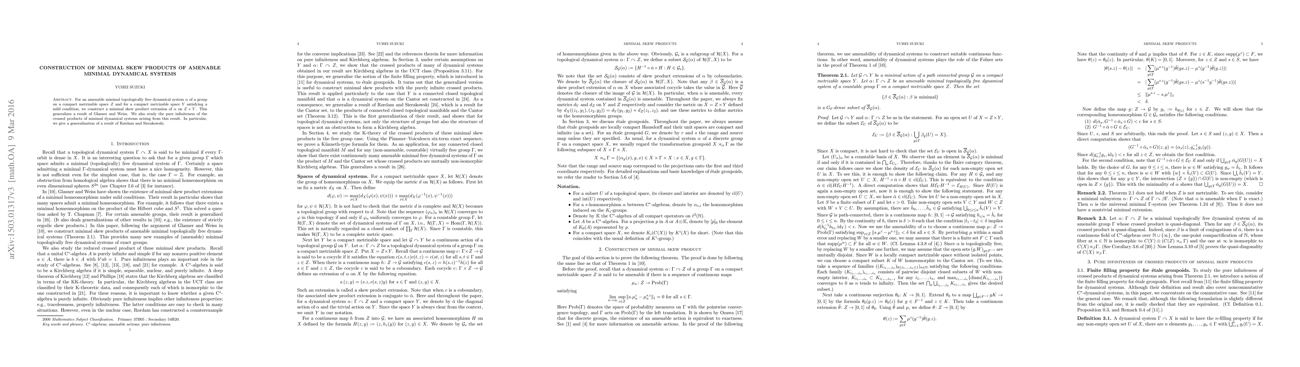 For an amenable minimal topologically free dynamical system $\alpha$ of a group on a compact metrizable space $Z$ and for a compact metrizable space $Y$ satisfying a mild condition, we construct a minimal skew product extension of $\alpha$ on $Z\times Y$. This generalizes a result of Glasner and Weiss. We also study the pure infiniteness of the crossed products of minimal dynamical systems arising from this result. In particular, we give a generalization of a result of R{\o}rdam and Sierakowski.