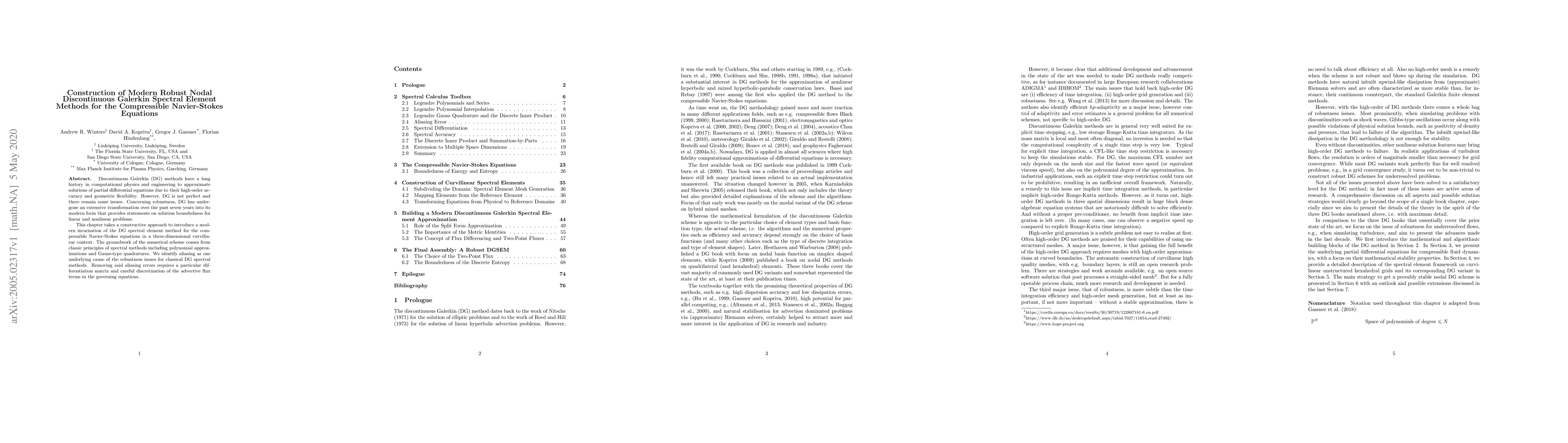 Discontinuous Galerkin (DG) methods have a long history in computational physics and engineering to approximate solutions of partial differential equations due to their high-order accuracy and geometric flexibility. However, DG is not perfect and there remain some issues. Concerning robustness, DG has undergone an extensive transformation over the past seven years into its modern form that provides statements on solution boundedness for linear and nonlinear problems. This chapter takes a constructive approach to introduce a modern incarnation of the DG spectral element method for the compressible Navier-Stokes equations in a three-dimensional curvilinear context. The groundwork of the numerical scheme comes from classic principles of spectral methods including polynomial approximations and Gauss-type quadratures. We identify aliasing as one underlying cause of the robustness issues for classical DG spectral methods. Removing said aliasing errors requires a particular differentiation matrix and careful discretization of the advective flux terms in the governing equations.