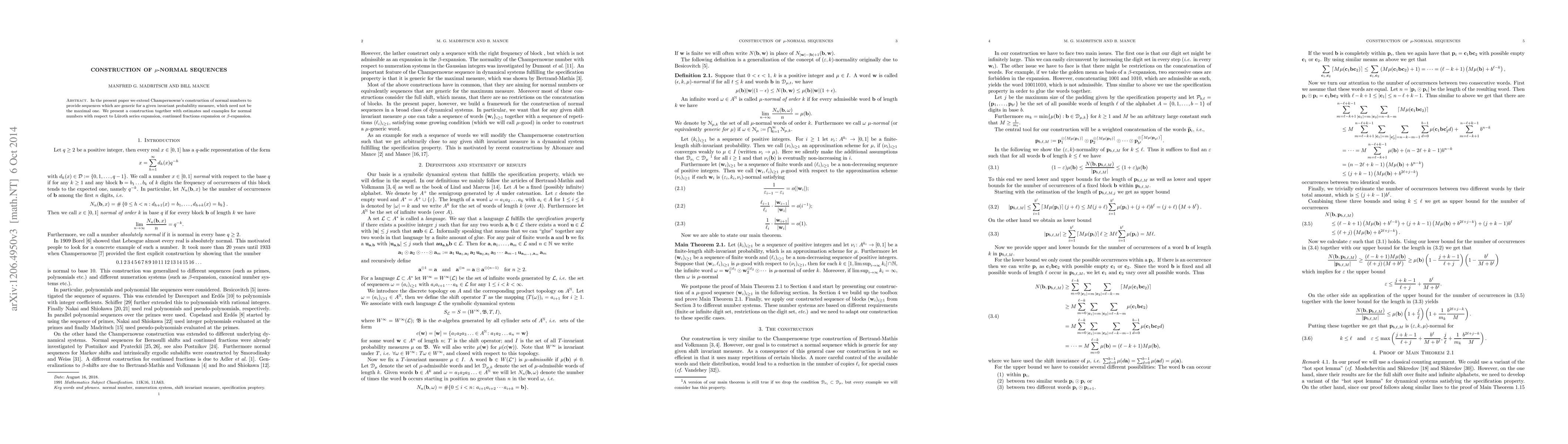 This paper extends Champernowne's method for constructing normal numbers to create sequences that are generic for any invariant probability measure, not just the maximal one. It provides constructions, estimates, and examples for normal sequences in various expansions like Lúroth series, continued fractions, and β-expansions.