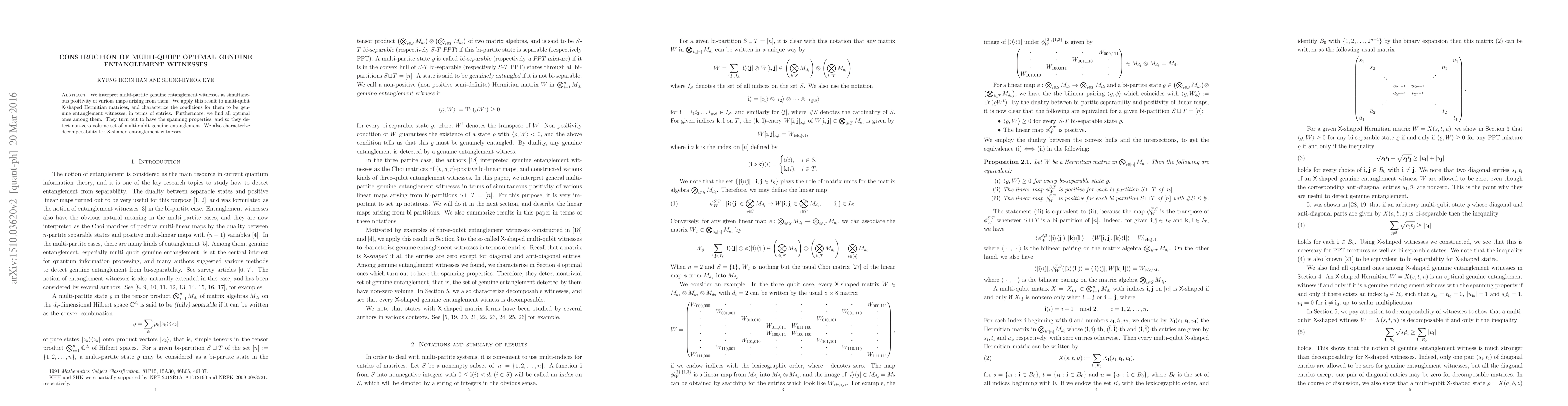 This paper constructs optimal genuine entanglement witnesses for multi-qubit systems using multi-partite entanglement witnesses based on positivity conditions. It identifies optimal X-shaped Hermitian matrices that detect genuine entanglement and characterizes their decomposability.