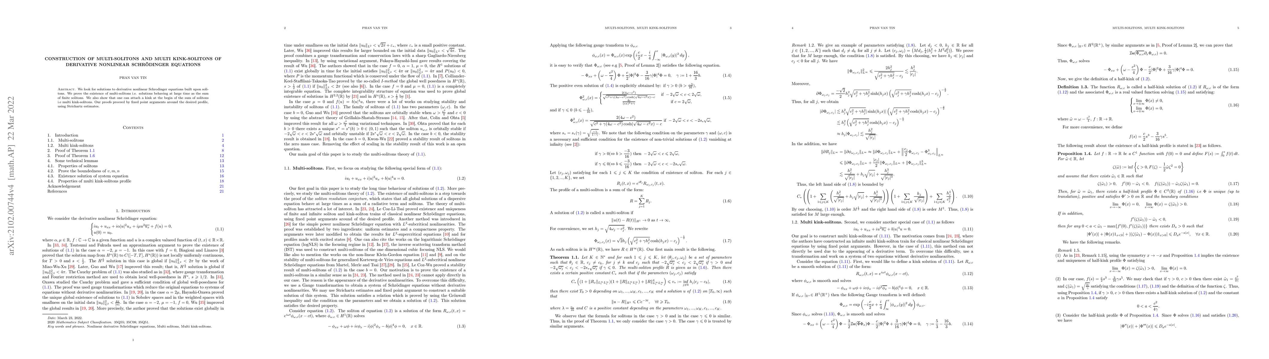 Researchers have discovered that derivative nonlinear Schr{"o}dinger equations can create multiple solitons and kink-solitons, which are solutions that behave like the sum of finitely many solitons at large time. This breakthrough was achieved using fixed point arguments and Strichartz estimates.