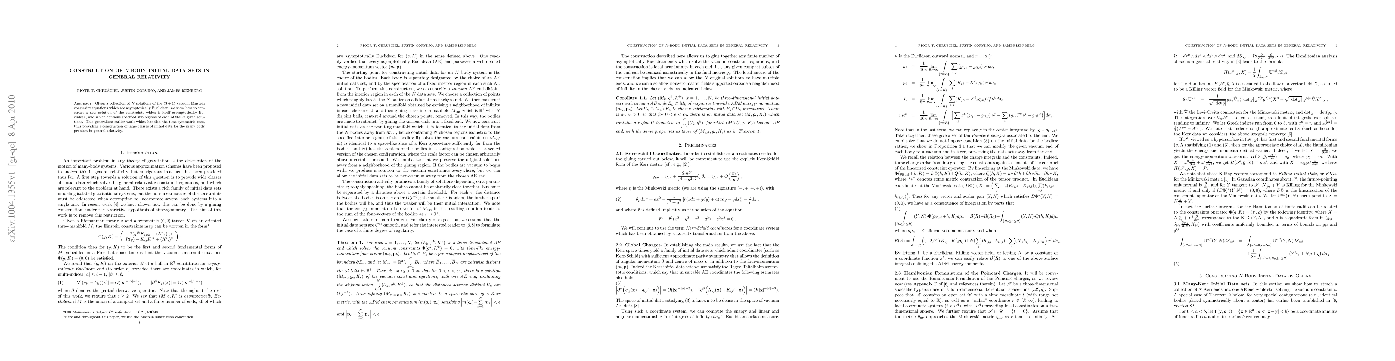 Given a collection of N solutions of the (3+1) vacuum Einstein constraint equations which are asymptotically Euclidean, we show how to construct a new solution of the constraints which is itself asymptotically Euclidean, and which contains specified sub-regions of each of the N given solutions. This generalizes earlier work which handled the time-symmetric case, thus providing a construction of large classes of initial data for the many body problem in general relativity.