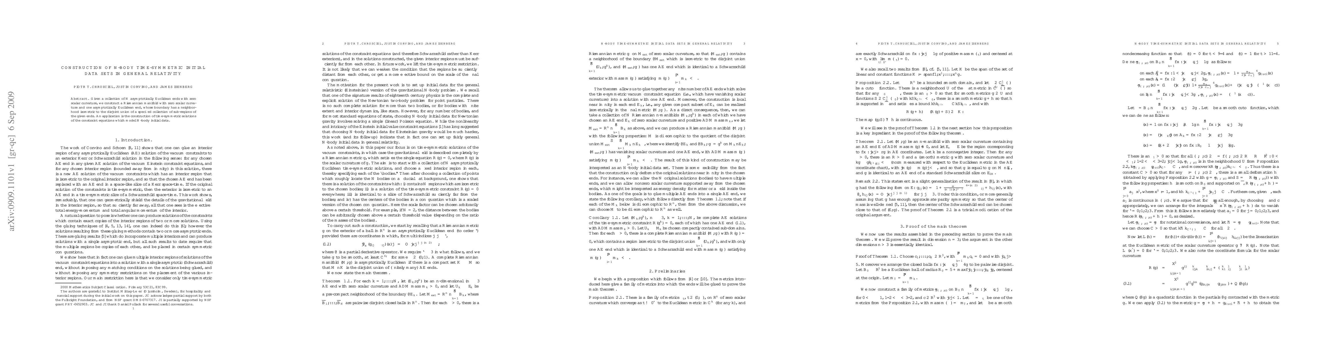 Researchers developed a method to create Riemannian manifolds with zero scalar curvature from N asymptotically Euclidean ends, which can model N-body initial data in general relativity.
