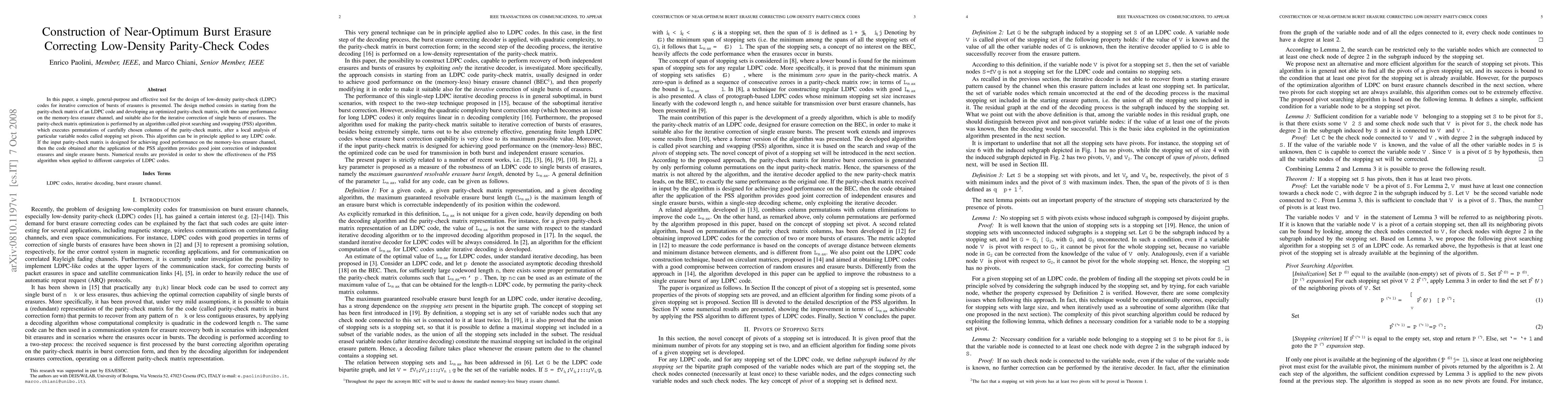 This paper presents a method for designing low-density parity-check (LDPC) codes optimized for burst erasure correction using the pivot searching and swapping (PSS) algorithm. The PSS algorithm optimizes the parity-check matrix to achieve good performance on both memory-less erasure channels and single bursts of erasures, demonstrating effectiveness through numerical results.