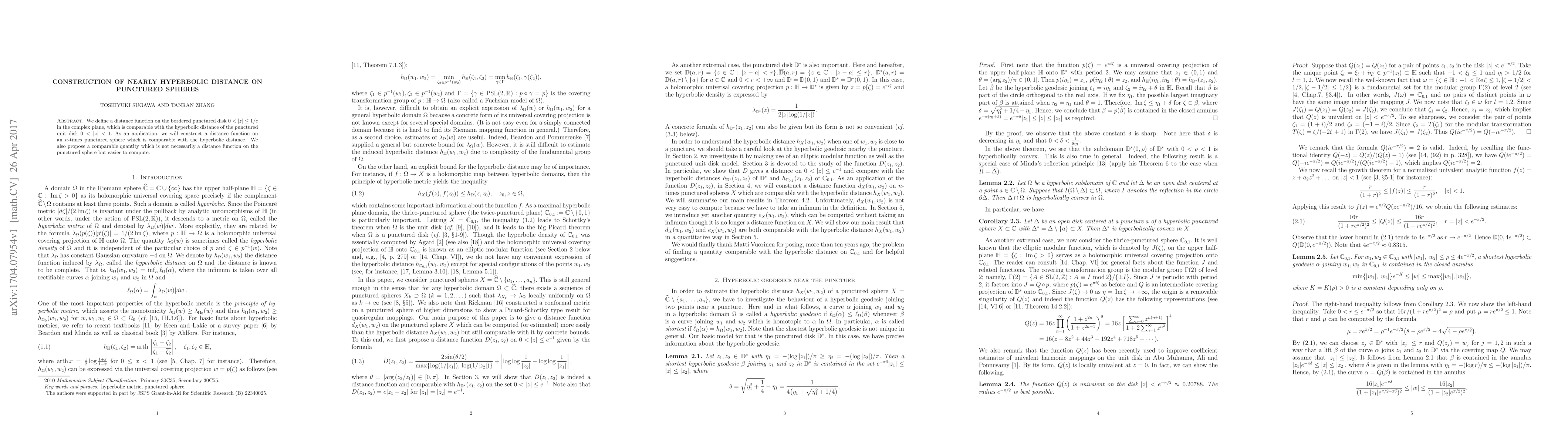 We define a distance function on the bordered punctured disk $0<|z|\le 1/e$ in the complex plane, which is comparable with the hyperbolic distance of the punctured unit disk $0<|z|<1.$ As an application, we will construct a distance function on an $n$-times punctured sphere which is comparable with the hyperbolic distance. We also propose a comparable quantity which is not necessarily a distance function on the punctured sphere but easier to compute.