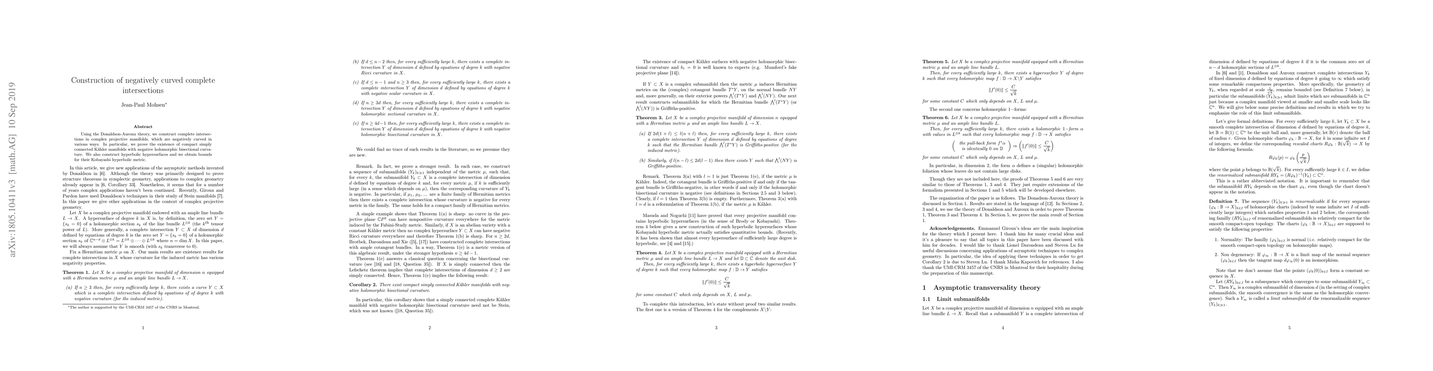 This paper constructs negatively curved complete intersections in complex projective manifolds using Donaldson-Auroux theory, proving the existence of compact, simply connected Kähler manifolds with negative holomorphic bisectional curvature and providing bounds for the Kobayashi hyperbolic metric of hyperbolic hypersurfaces.