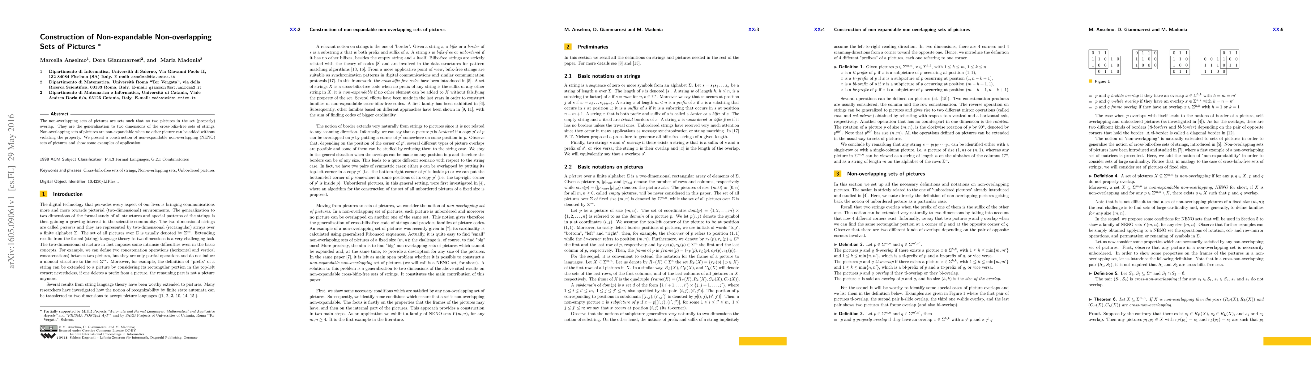 This paper constructs non-expandable non-overlapping (NENO) sets of pictures, where no two pictures overlap, extending the concept of cross-bifix-free sets from strings to two dimensions. It demonstrates the construction method and provides examples of its applications.