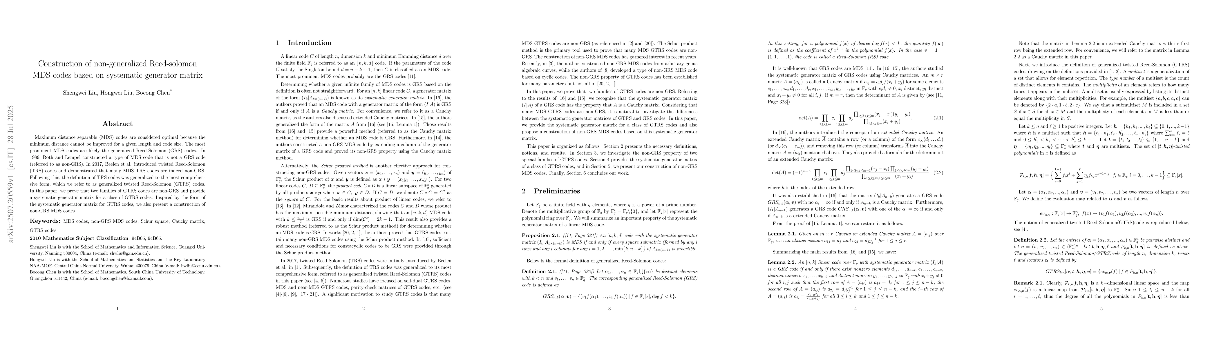 Maximum distance separable (MDS) codes are considered optimal because the minimum distance cannot be improved for a given length and code size. The most prominent MDS codes are likely the generalized Reed-Solomon (GRS) codes. In 1989, Roth and Lempel constructed a type of MDS code that is not a GRS code (referred to as non-GRS). In 2017, Beelen et al. introduced twisted Reed-Solomon (TRS) codes and demonstrated that many MDS TRS codes are indeed non-GRS. Following this, the definition of TRS codes was generalized to the most comprehensive form, which we refer to as generalized twisted Reed-Solomon (GTRS) codes. In this paper, we prove that two families of GTRS codes are non-GRS and provide a systematic generator matrix for a class of GTRS codes. Inspired by the form of the systematic generator matrix for GTRS codes,we also present a construction of non-GRS MDS codes.