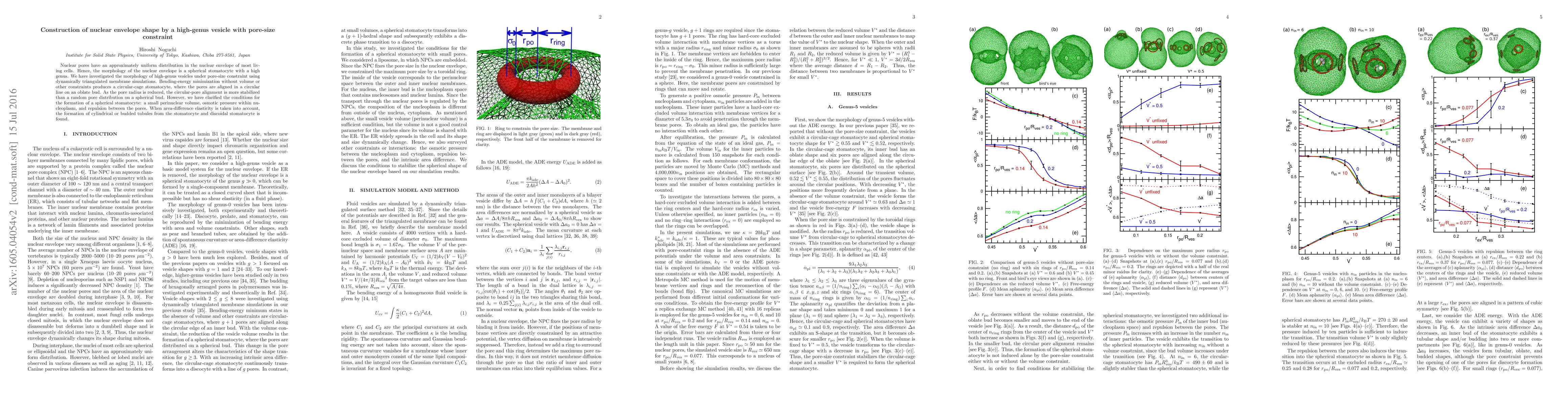 Nuclear pores have an approximately uniform distribution in the nuclear envelope of most living cells. Hence, the morphology of the nuclear envelope is a spherical stomatocyte with a high genus. We have investigated the morphology of high-genus vesicles under pore-size constraint using dynamically triangulated membrane simulations. Bending-energy minimization without volume or other constraints produces a circular-cage stomatocyte, where the pores are aligned in a circular line on an oblate bud. As the pore radius is reduced, the circular-pore alignment is more stabilized than a random pore distribution on a spherical bud. However, we have clarified the conditions for the formation of a spherical stomatocyte: a small perinuclear volume, osmotic pressure within nucleoplasm, and repulsion between the pores. When area-difference elasticity is taken into account, the formation of cylindrical or budded tubules from the stomatocyte and discoidal stomatocyte is found.