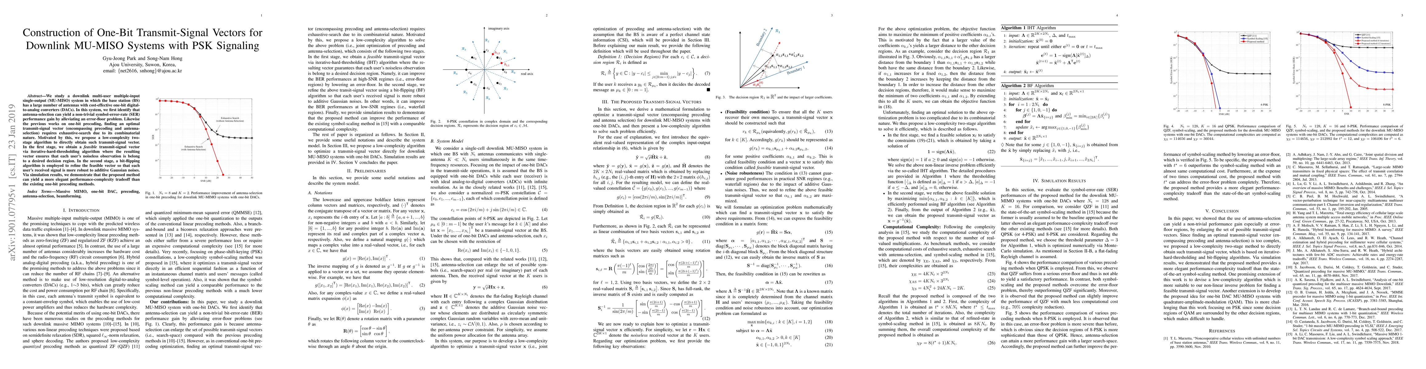 We study a downlink multi-user multiple-input single-output (MU-MISO) system in which the base station (BS) has a large number of antennas with cost-effective one-bit digital-to-analog converters (DACs). In this system, we first identify that antenna-selection can yield a non-trivial symbol-error-rate (SER) performance gain by alleviating an error-floor problem. Likewise the previous works on one-bit precoding, finding an optimal transmit-signal vector (encompassing precoding and antenna-selection) requires exhaustive-search due to its combinatorial nature. Motivated by this, we propose a low-complexity two-stage algorithm to directly obtain such transmit-signal vector. In the first stage, we obtain a feasible transmit-signal vector via iterative-hard-thresholding algorithm where the resulting vector ensures that each user's noiseless observation is belong to a desired decision region. In the second stage, a bit-flipping algorithm is employed to refine the feasible vector so that each user's received signal is more robust to additive Gaussian noises. Via simulation results, we demonstrate that the proposed method can yield a more elegant performance-complexity tradeoff than the existing one-bit precoding methods.