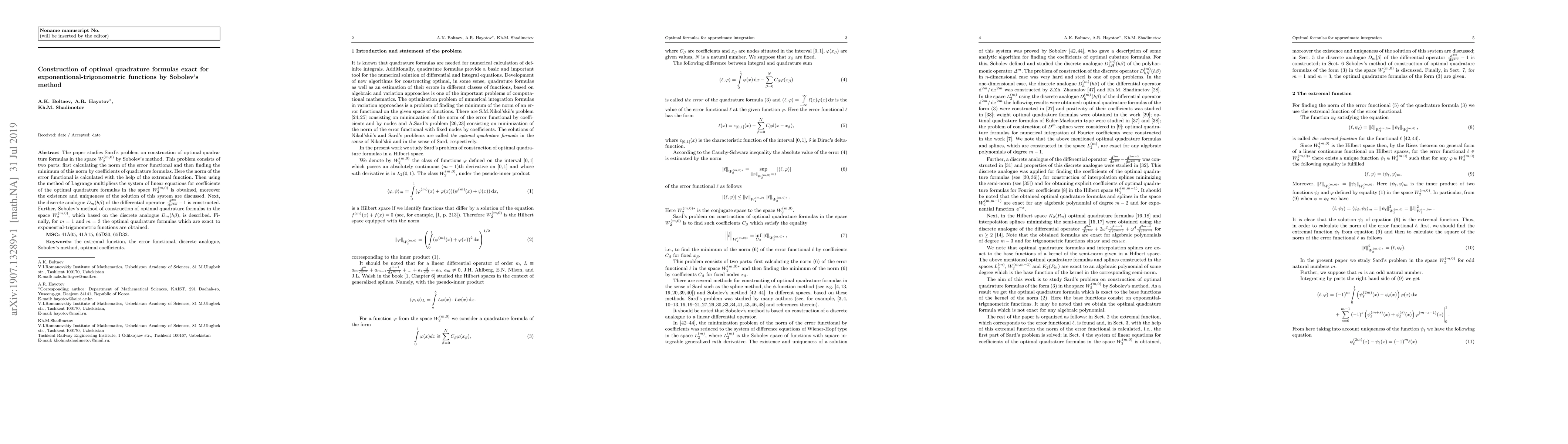 This paper constructs optimal quadrature formulas exact for exponential-trigonometric functions using Sobolev's method, solving Sard's problem by calculating the error norm and deriving a system of linear equations for quadrature coefficients. Optimal formulas are obtained for $m=1$ and $m=3$.