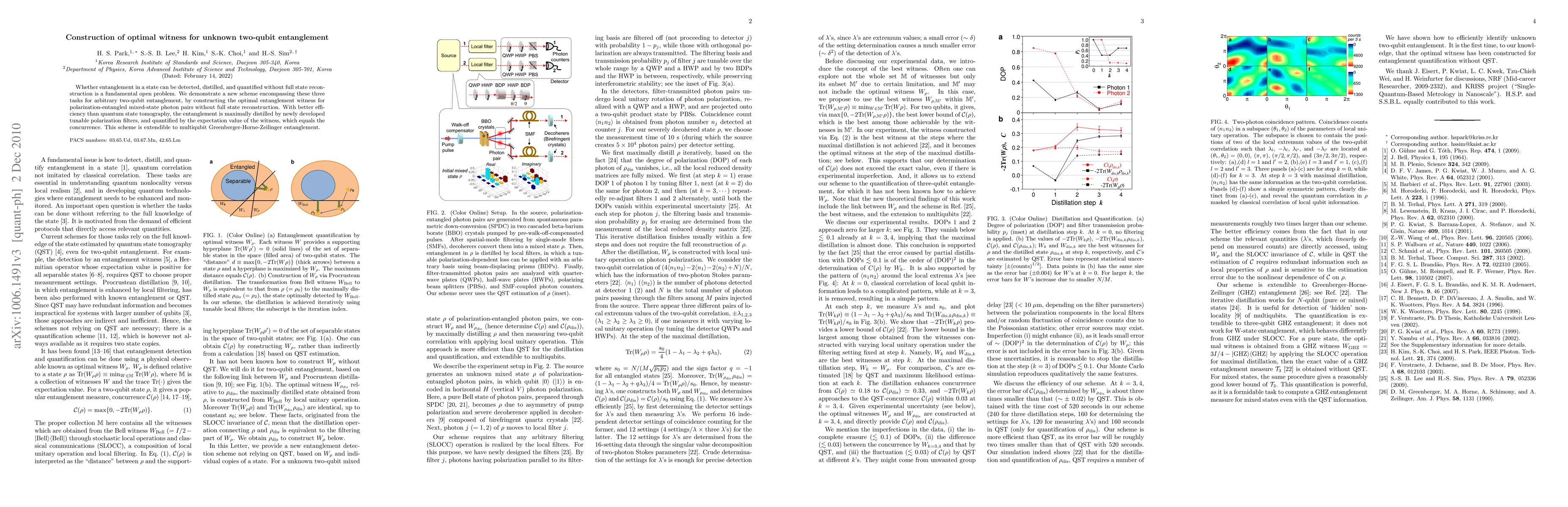 Whether entanglement in a state can be detected, distilled, and quantified without full state reconstruction is a fundamental open problem. We demonstrate a new scheme encompassing these three tasks for arbitrary two-qubit entanglement, by constructing the optimal entanglement witness for polarization-entangled mixed-state photon pairs without full state reconstruction. With better efficiency than quantum state tomography, the entanglement is maximally distilled by newly developed tunable polarization filters, and quantified by the expectation value of the witness, which equals the concurrence. This scheme is extendible to multiqubit Greenberger-Horne-Zeilinger entanglement.