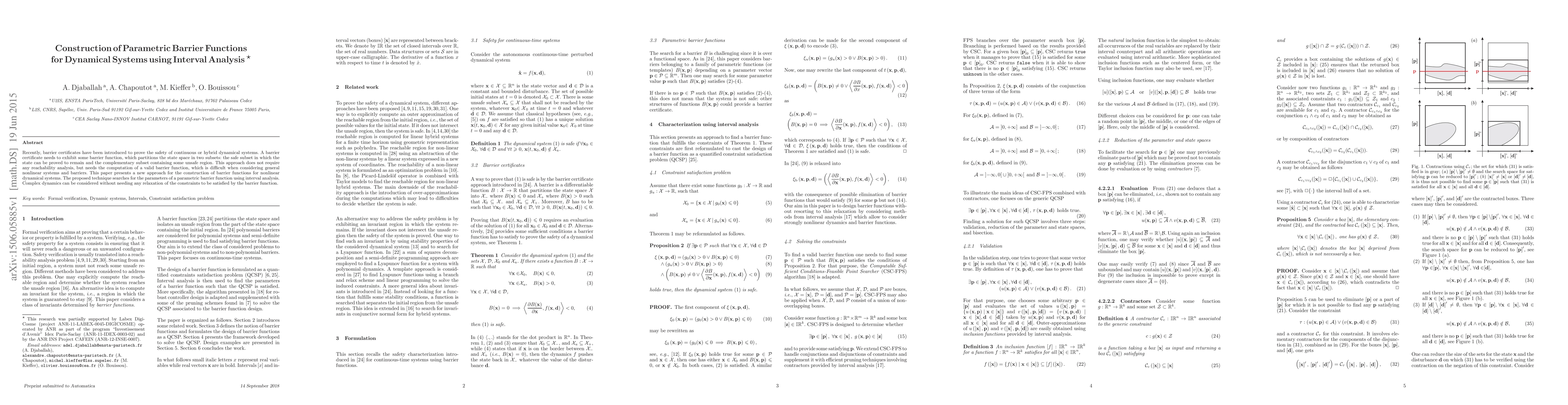 Recently, barrier certificates have been introduced to prove the safety of continuous or hybrid dynamical systems. A barrier certificate needs to exhibit some barrier function, which partitions the state space in two subsets: the safe subset in which the state can be proved to remain and the complementary subset containing some unsafe region. This approach does not require any reachability analysis, but needs the computation of a valid barrier function, which is difficult when considering general nonlinear systems and barriers. This paper presents a new approach for the construction of barrier functions for nonlinear dynamical systems. The proposed technique searches for the parameters of a parametric barrier function using interval analysis. Complex dynamics can be considered without needing any relaxation of the constraints to be satisfied by the barrier function.