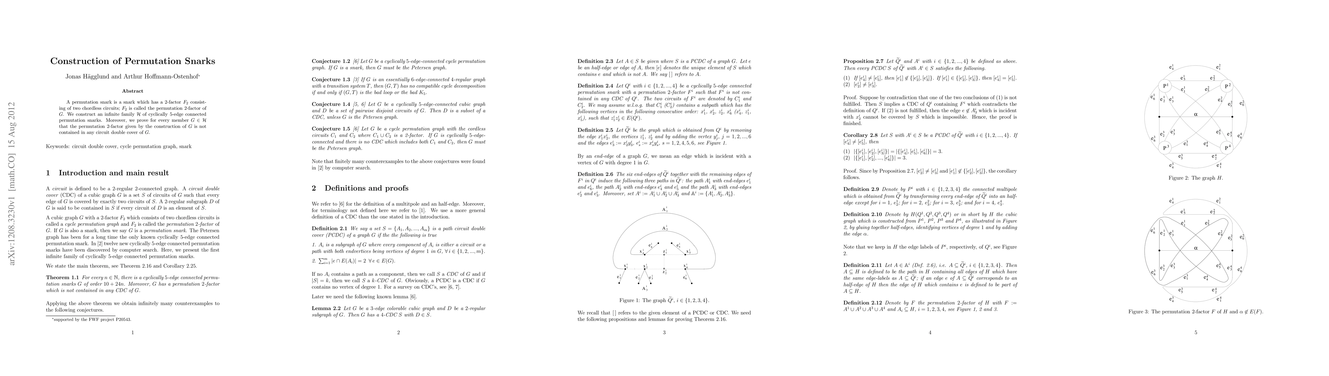 A permutation snark is a snark which has a 2-factor $F_2$ consisting of two chordless circuits; $F_2$ is called the permutation 2-factor of $G$. We construct an infinite family $\mathcal H$ of cyclically 5-edge connected permutation snarks. Moreover, we prove for every member $G \in \mathcal H$ that the permutation 2-factor given by the construction of $G$ is not contained in any circuit double cover of $G$.