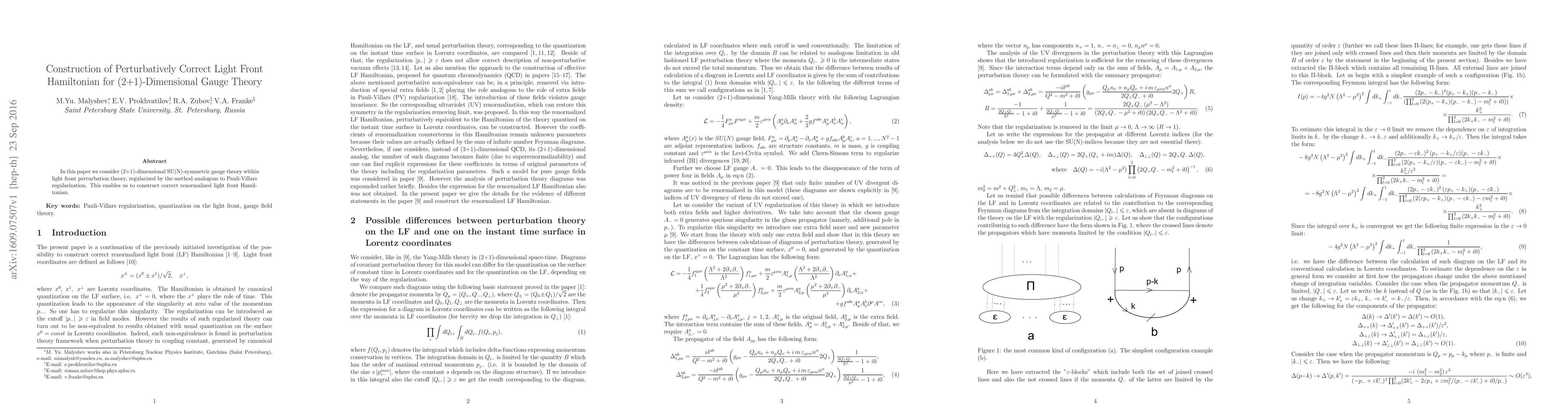 In this paper we consider (2+1)-dimensional SU(N)-symmetric gauge theory within light front perturbation theory, regularized by the method analogous to Pauli-Villars regularization. This enables us to construct correct renormalized light front Hamiltonian.