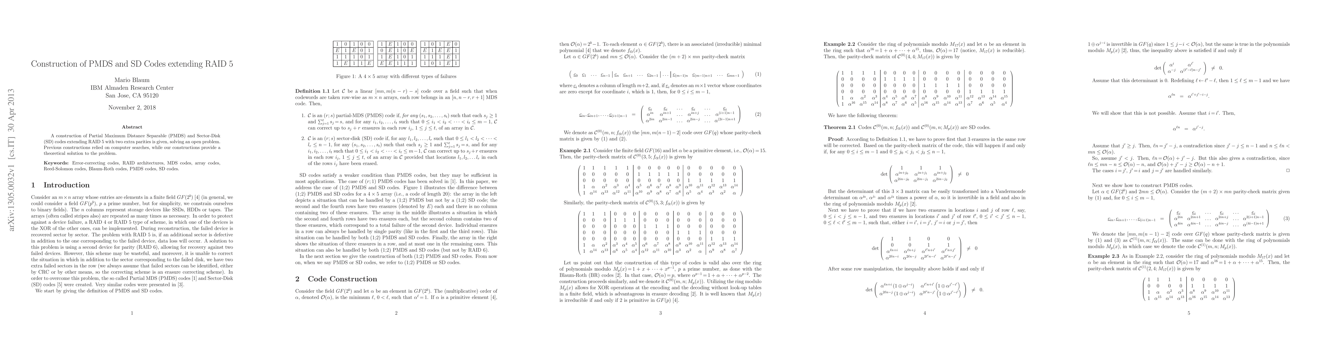 This paper presents a theoretical construction of Partial Maximum Distance Separable (PMDS) and Sector-Disk (SD) codes that extend RAID 5 by adding two extra parities, offering a solution to an open problem previously addressed only through computer searches.