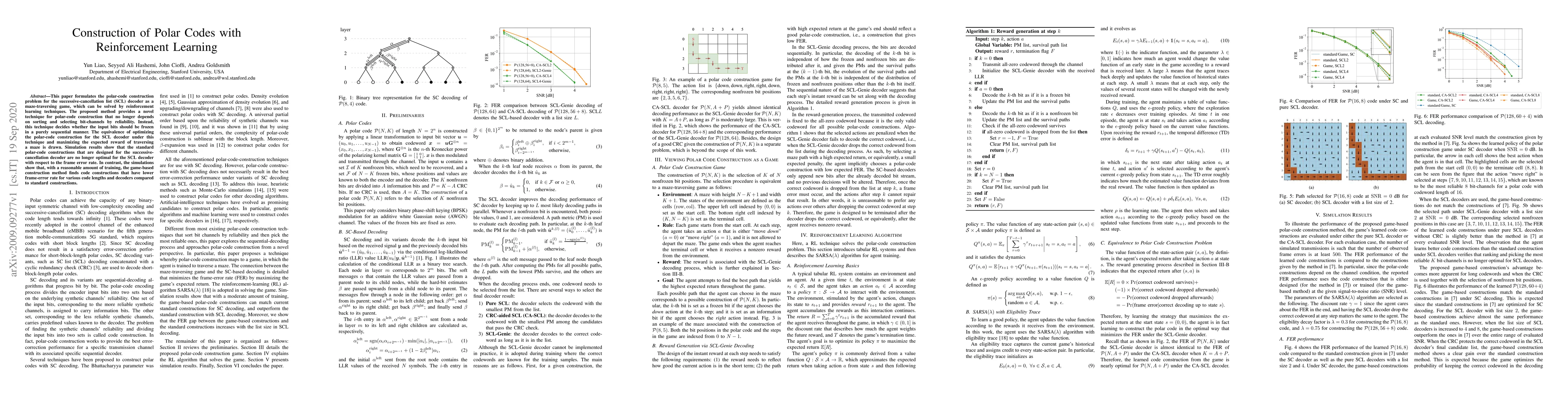 This paper proposes a reinforcement learning approach to construct polar codes for the successive-cancellation list decoder, framing the problem as a maze-traversing game. Unlike traditional methods, this technique sequentially decides bit-channel freezing without sorting, leading to lower frame-error rates compared to standard constructions.