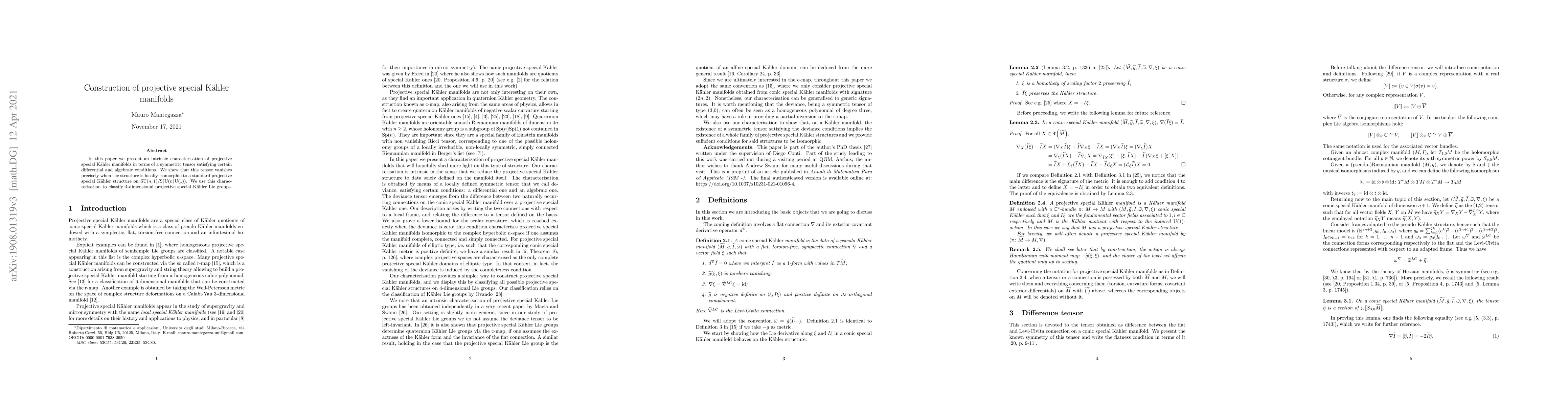 This paper introduces an intrinsic characterization of projective special Kähler manifolds through a symmetric tensor that meets specific differential and algebraic criteria, identifying when the structure is isomorphic to a standard model. It classifies 4-dimensional projective special Kähler Lie groups using this new characterization.